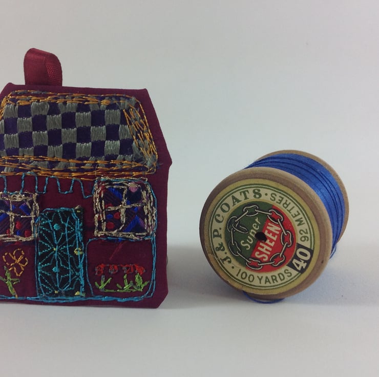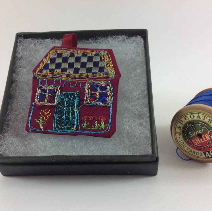 A unique textile art brooch made with fragments of silk tie fabric remnants. A quirky house with beautiful details sewn with free motion machine embroidery. The brooch is lined and has a brooch fastening on the reverse. It measures approximately 6x 5cm and comes in a black card gift box. Free Postage in UK