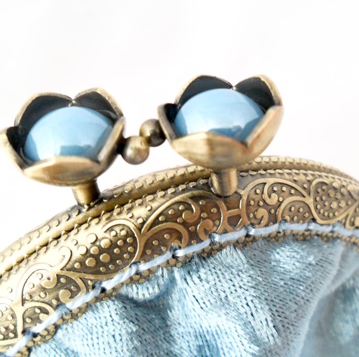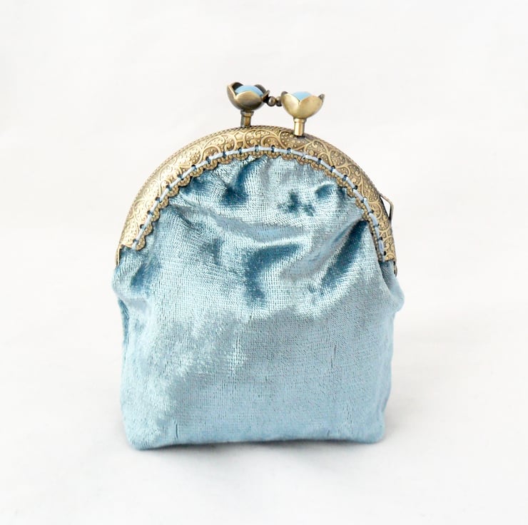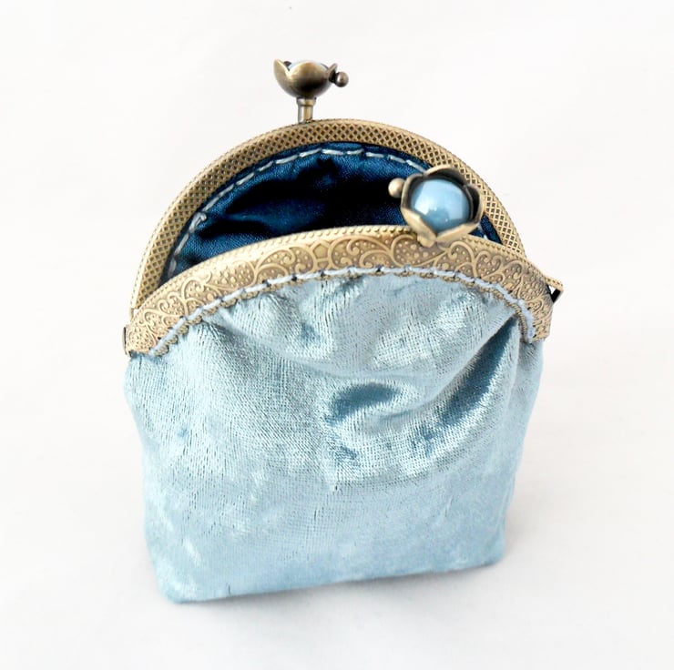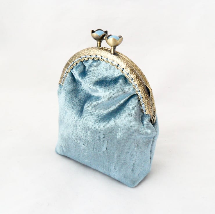 The aqua crushed velvet of this handmade coin purse is perfectly complemented by the bronze coloured frame. The 'flower' kiss lock clasp adds the finishing touch. It's lined in a teal satin and will hold a debit card, key and a small amount of cash, just pop it into your clutch and you're good to go! Makes a great gift or stocking filler.