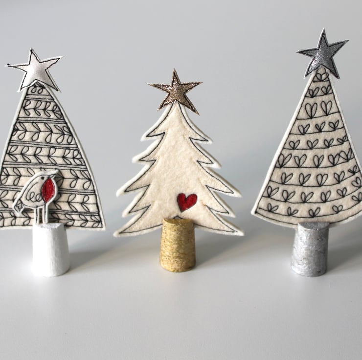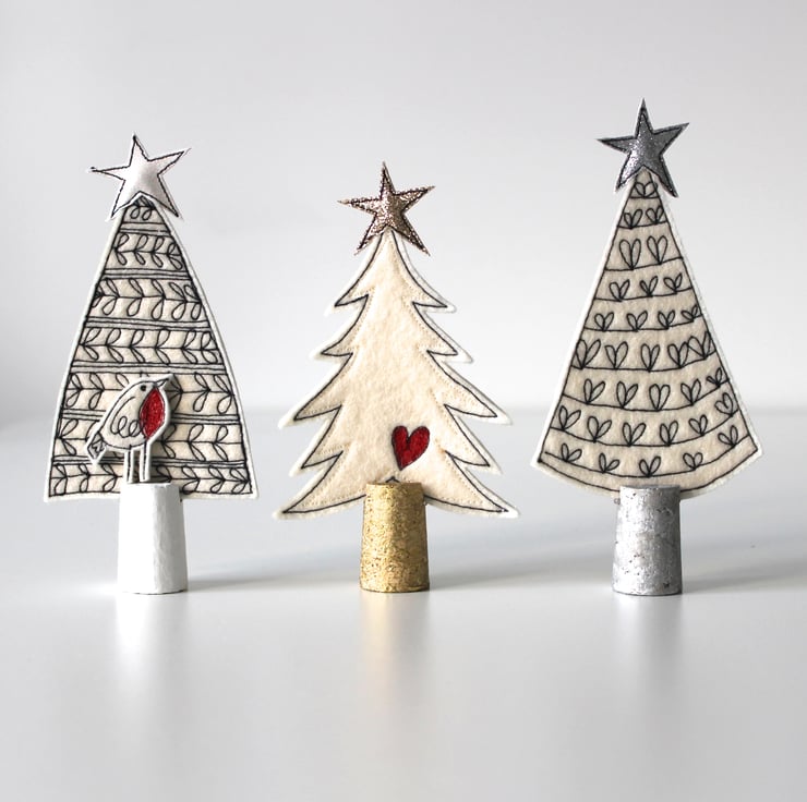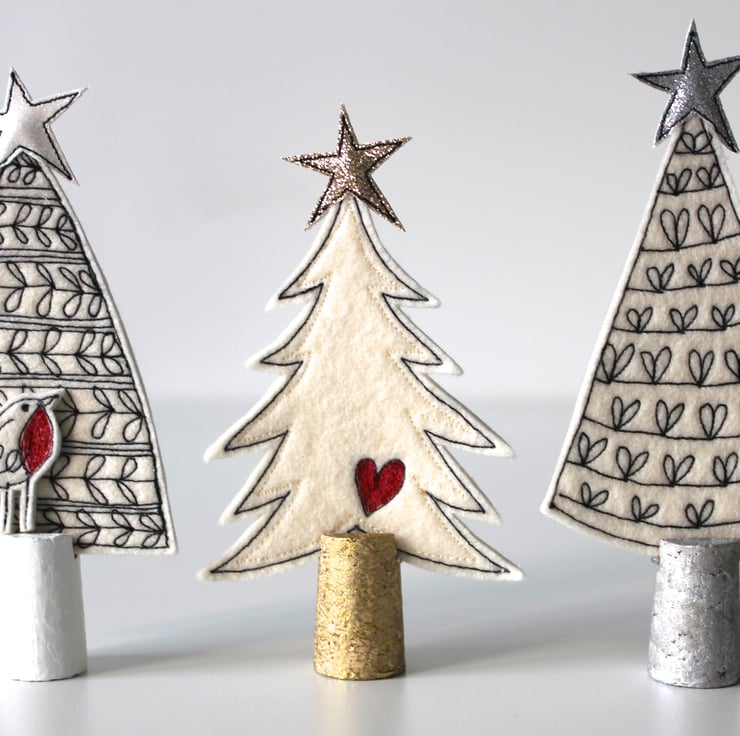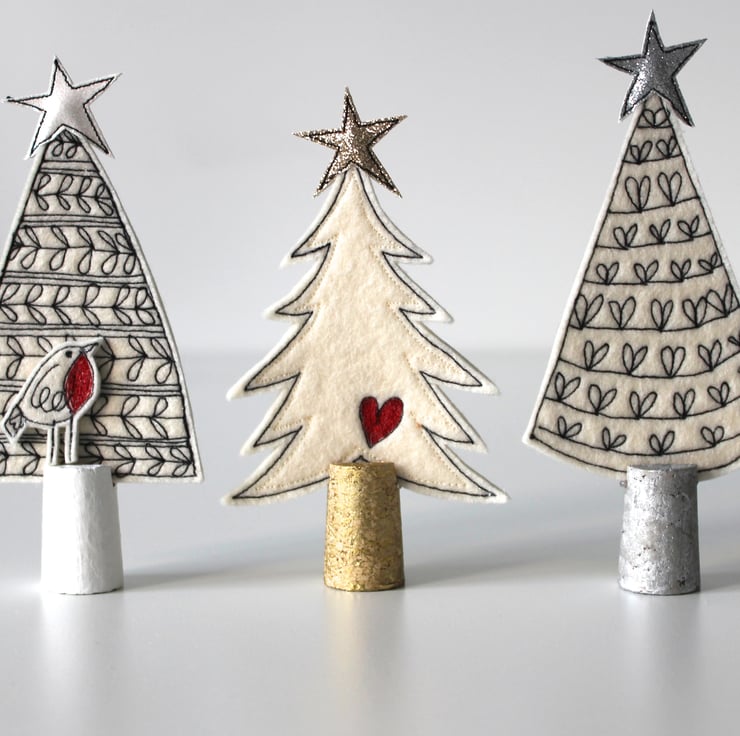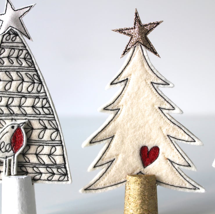 Little trees are created using free hand machine embroidery, 100% wool felt, glitter cloth and painted cork trunks.