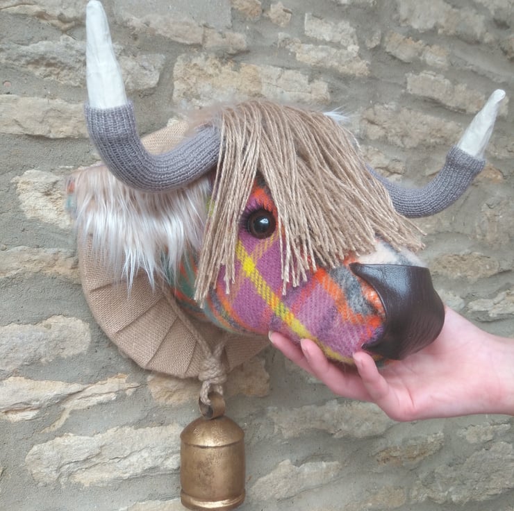 Handmade wall mounted Highland Cow Coo in Cottage Candy pure new wool with working bell.