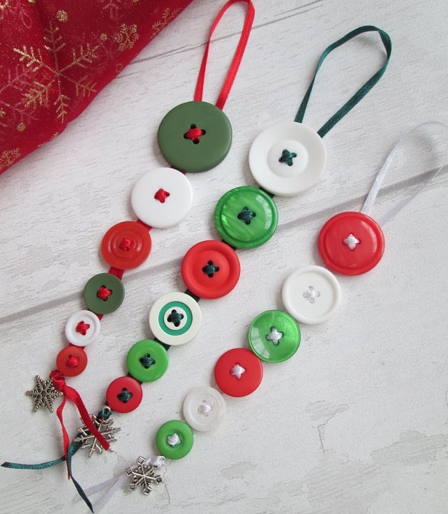 A trio of unusual button Christmas decorations in traditional festive colours. Six graduated buttons are strung in a row on narrow satin ribbon with a snowflake charm at the bottom, and a hanging loop at the top. Dangles vary in length due to different sizes of buttons and each dangle is unique. The dangles in this set are approximately 22, 23.5 and 26 cm long (including hanging loops).