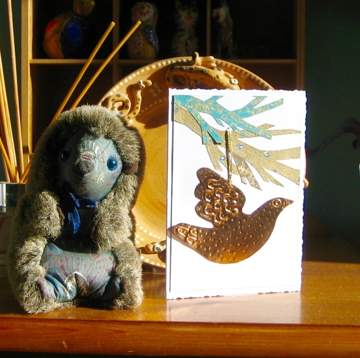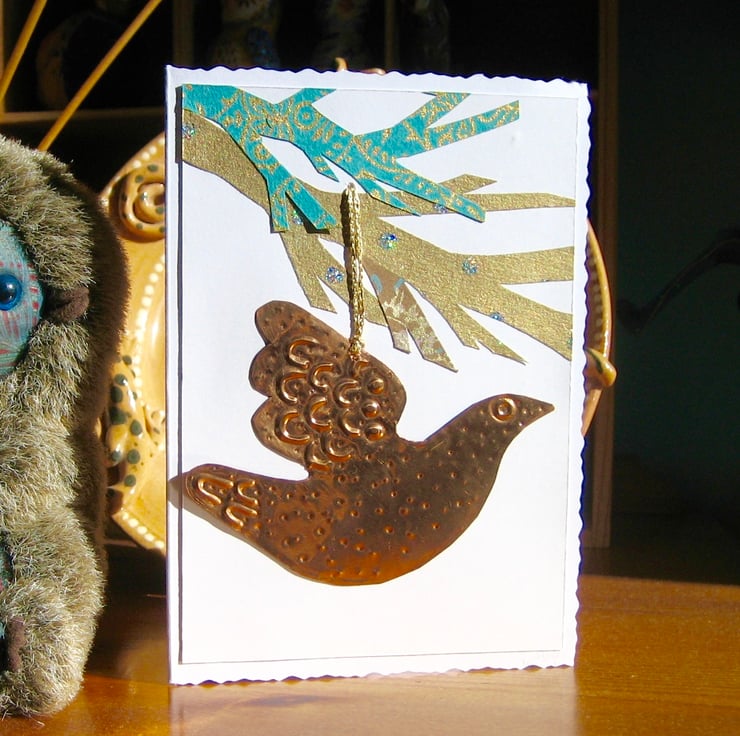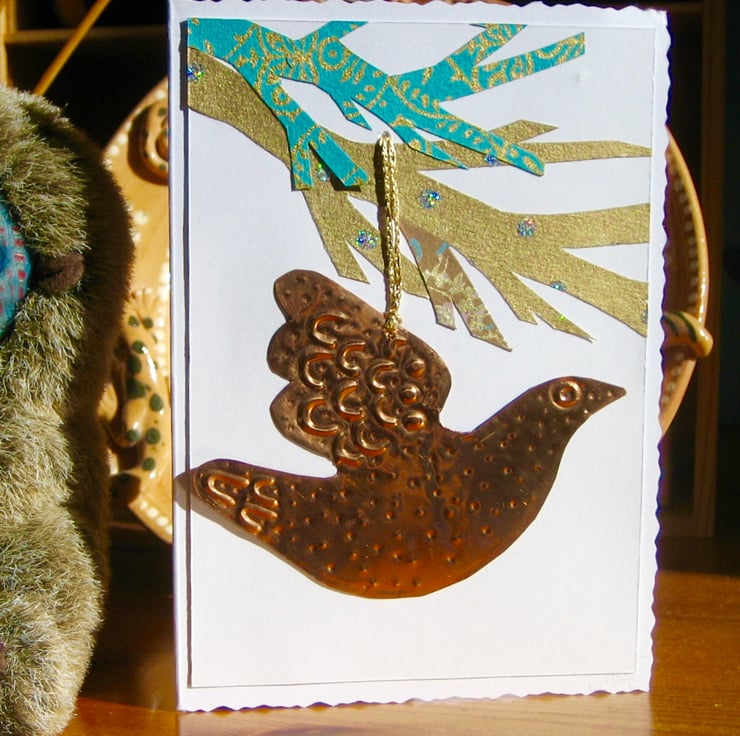This deckle-edge card has been decorated with hand-cut paper and features a removable copper decoration. Blank for your own message, The card measures 150 x 105mm and comes with an envelope.