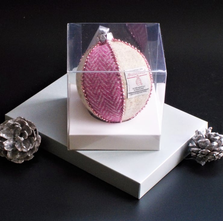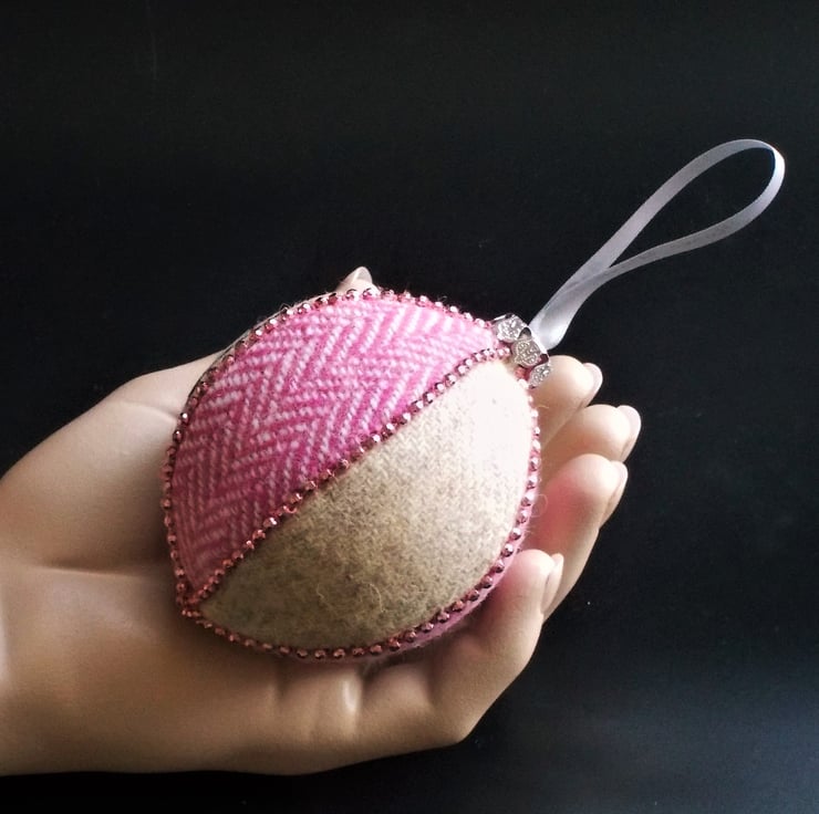 I have created this lovely bauble with six segments of fabric, alternating pink and cream herringbone with mottled cream. Each shaped piece is hand-stitched together to make the 3D shape. Then I have decorated the segment seams with sparkling bead ribbon trim, also hand-stitched into place. It is approx. 8.5cm in diameter and comes complete with a silver satin ribbon hanging loop. A small "Orb" label, your guarantee of genuine Harris tweed, is proudly displayed.