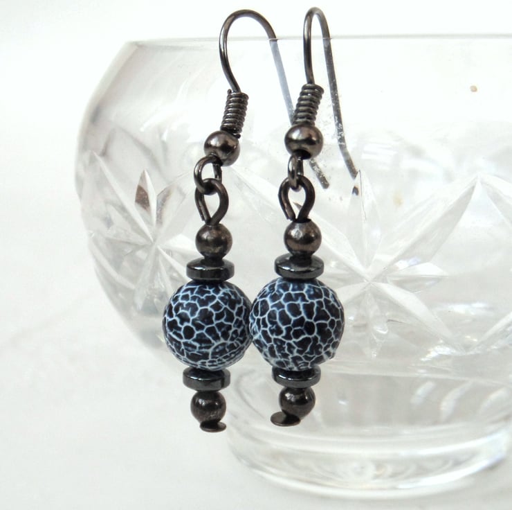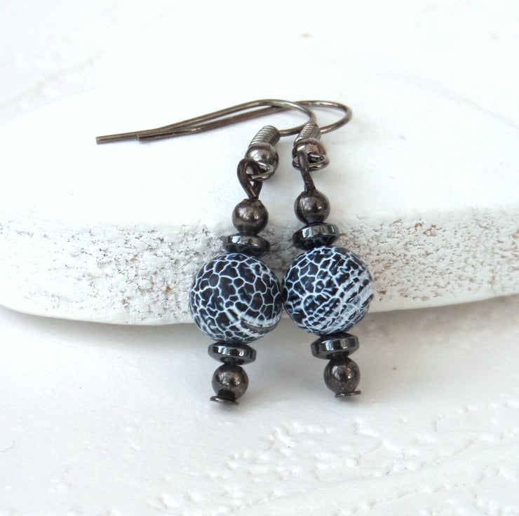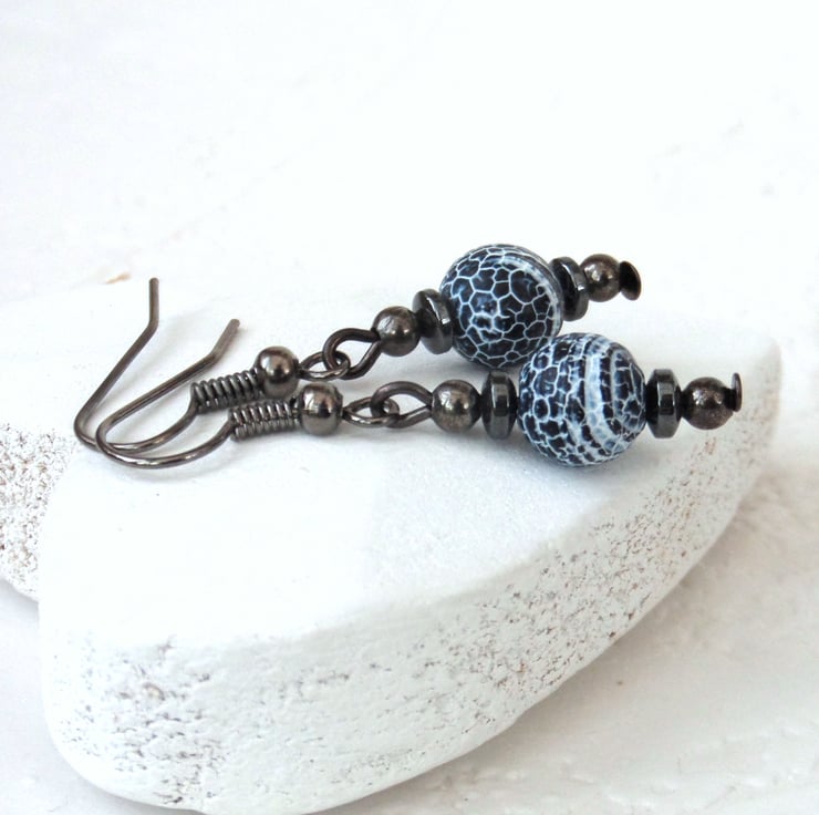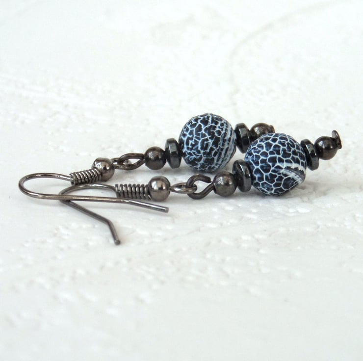 A lovely pair of earrings, made with 8 mm black and white fire agates that hang from gunmetal earwires with little hematite beads.