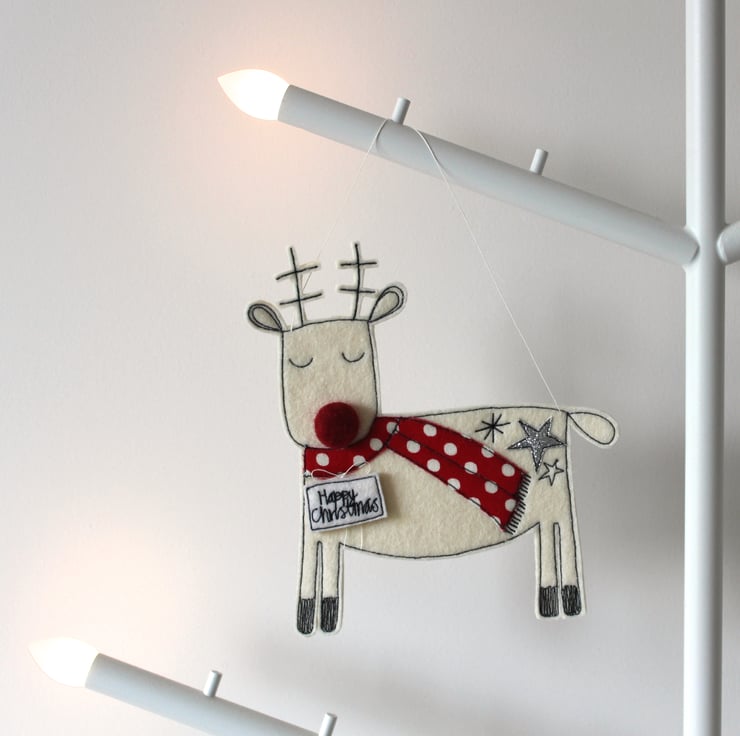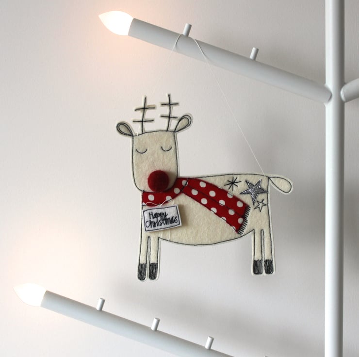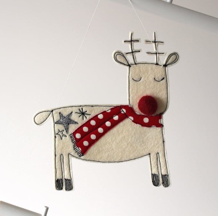 With a warming scarf, wool felt ball nose and stars; dreaming reindeer is happily waiting to pull Santa's sleigh.
