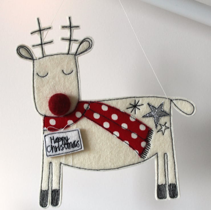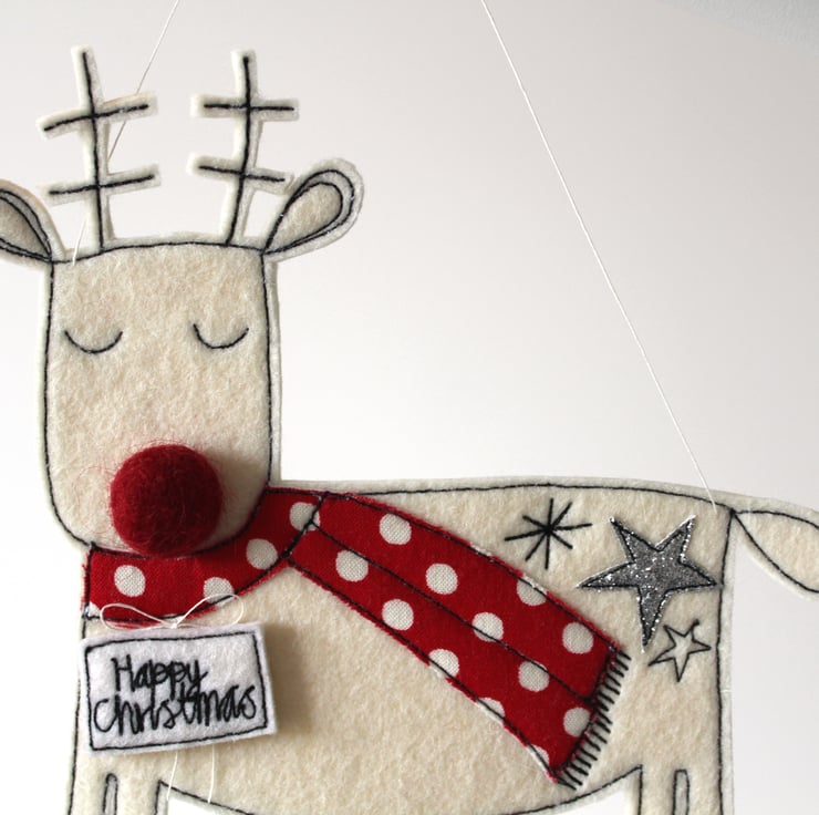 Reindeer is created using 100% wool felt, silver glitter cloth, cotton cloth and free hand machine embroidery.