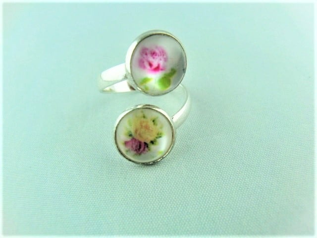 The ring base is adjustable so it will fit most sized fingers and it has two 12 mm round white cabochons with pink and yellow flowers and a green leaf on each cabochon. The ring base is silver plated.