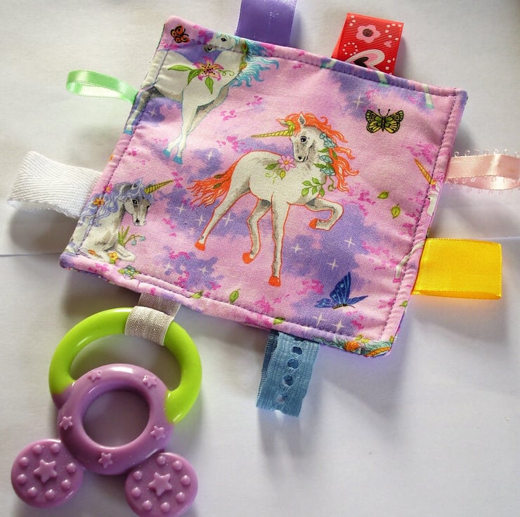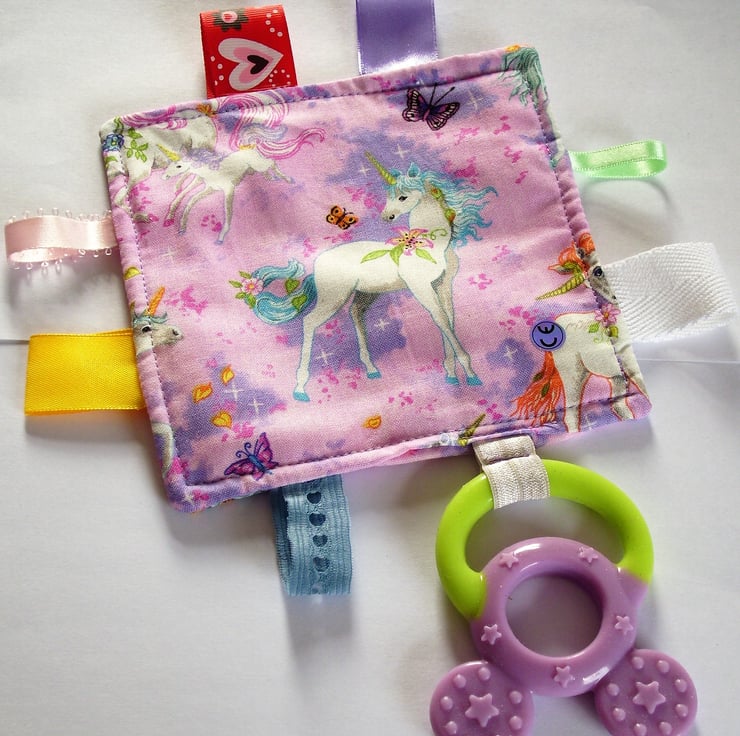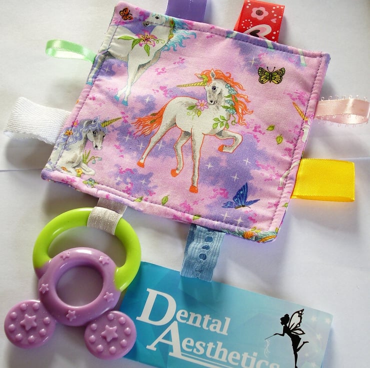 A very pretty pink cotton tagged cloth (5" x 5") with a pale green and mauve teether attached. There is a white unicorn on each side. The tags are double stitched for safety, and are of various colours, widths and textures. The soft silicone teether is sourced from a reputable dental supplier. The tagged teether can be machine washed. It is CE marked.