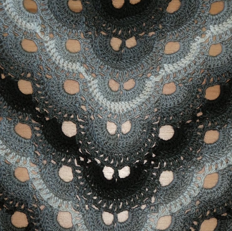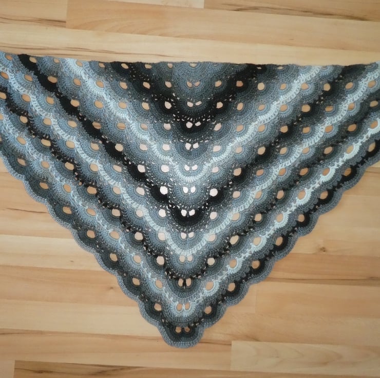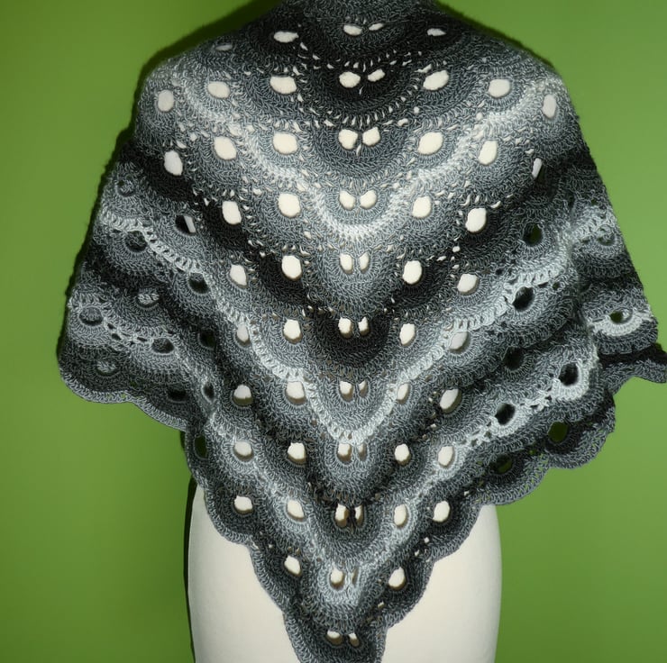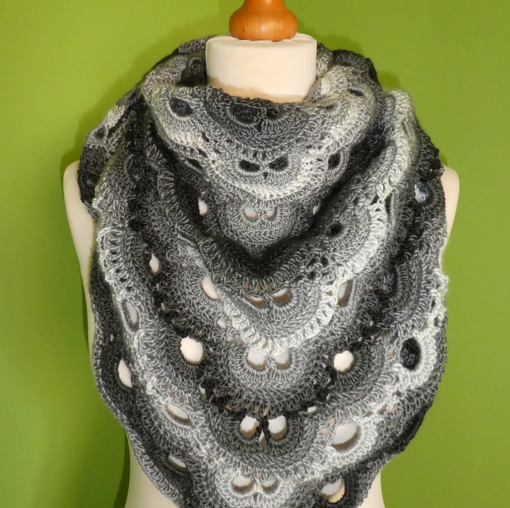 I have created this triangular crochet shawl in monochrome colours. It is beautifully soft and has a wonderful drape. The yarn is a double knitting weight 15% wool and 85% acrylic blend, and is a long colour change yarn. It is light and airy but lovely and warm.