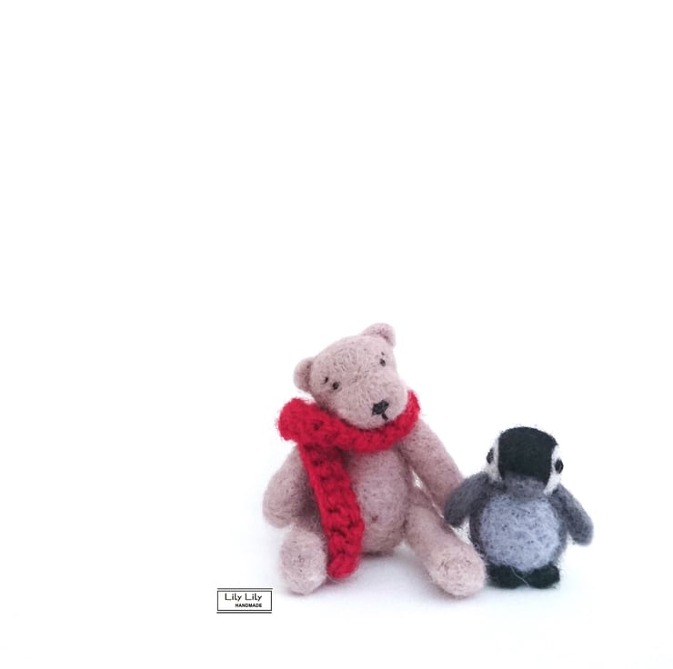 A traditional miniature muted beige teddy bear needle felted by Lily Lily Handmade. A one of a kind collectible, perfect as a ornament or lucky mascot. The bear is warm and cosy wrapped up in a red crocheted woolly scarf. The scarf is removable.