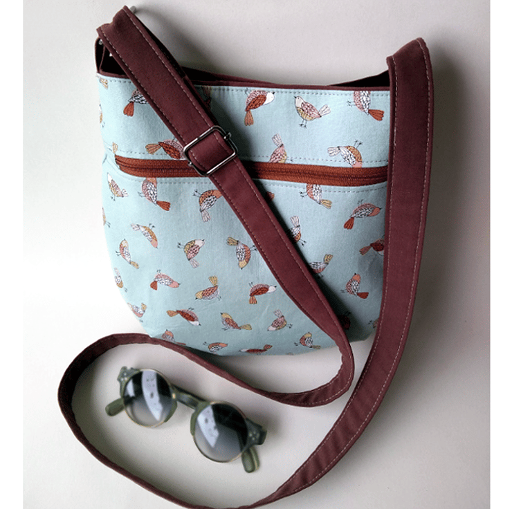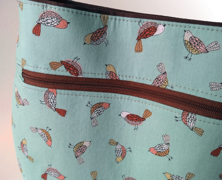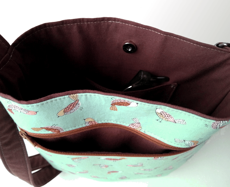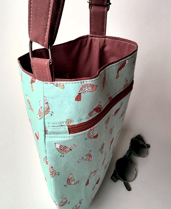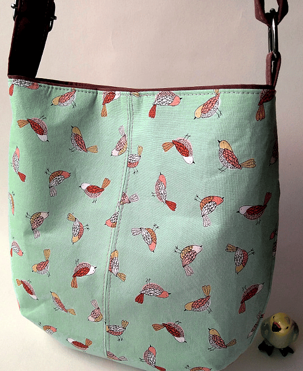 Here we have a beautiful crossbody bag, covered in pretty birds. This fabric is very pretty, warranting a close-up photo, so you can see the different birds in shades of terracotta, peach & mustard. The background is a mint green.