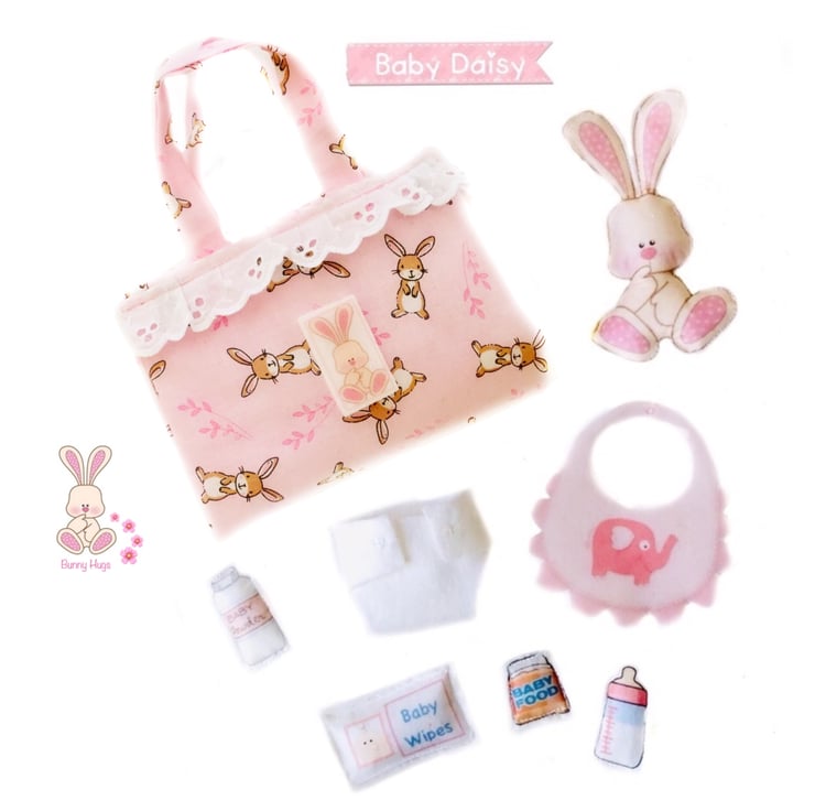 The bag is made from best quality cotton in a bunny print and is trimmed with daisies. In the bag are a little stitched and stuffed bunny; pretend baby wipes, talcum powder, baby food and a bottle; a bib and a spare nappy.