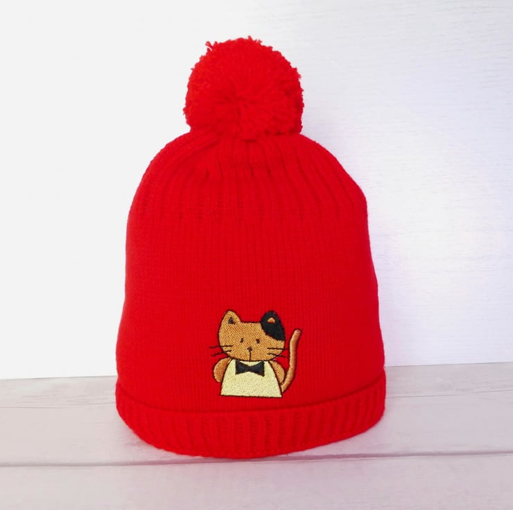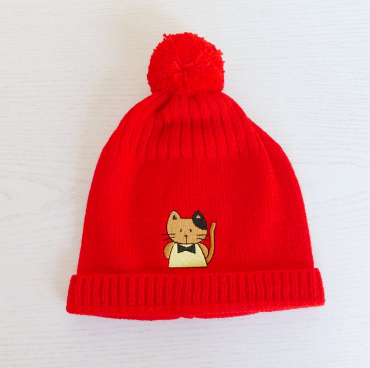 A lovely knitted hat for toddler made from red Yeoman Cashmillon 4 ply acrylic yarn with embroidered cat motif and pom pom.