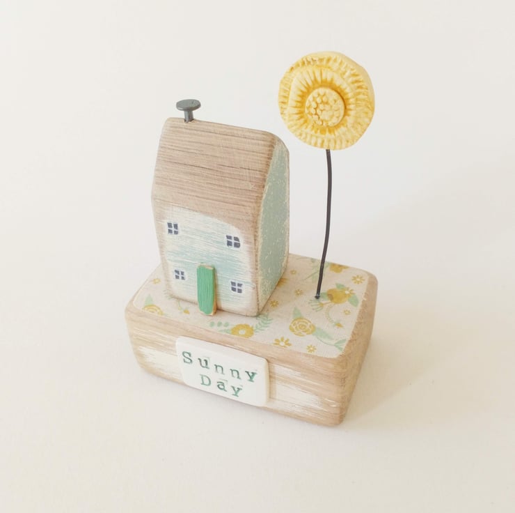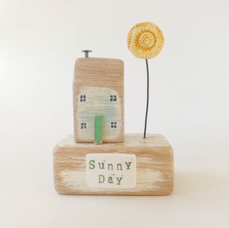 The clay stamped sign on the decoupaged block says 'Sunny Day'
