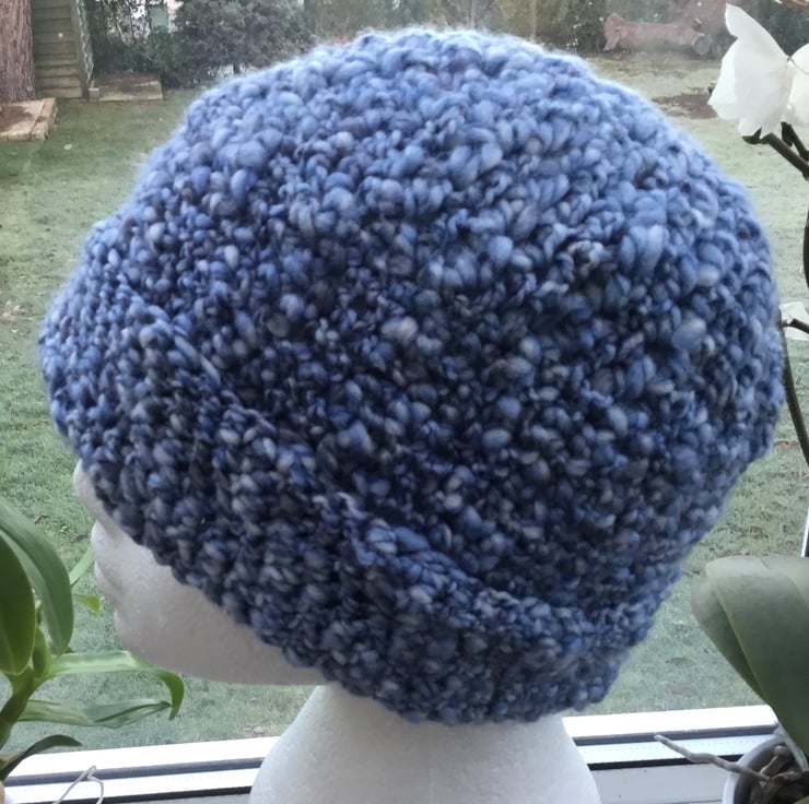 A beautiful soft blue toned, chunky, hand crocheted hat, warm and cosy, without being too heavy in yarn weight! Also matches some long length scarf listed separately.
