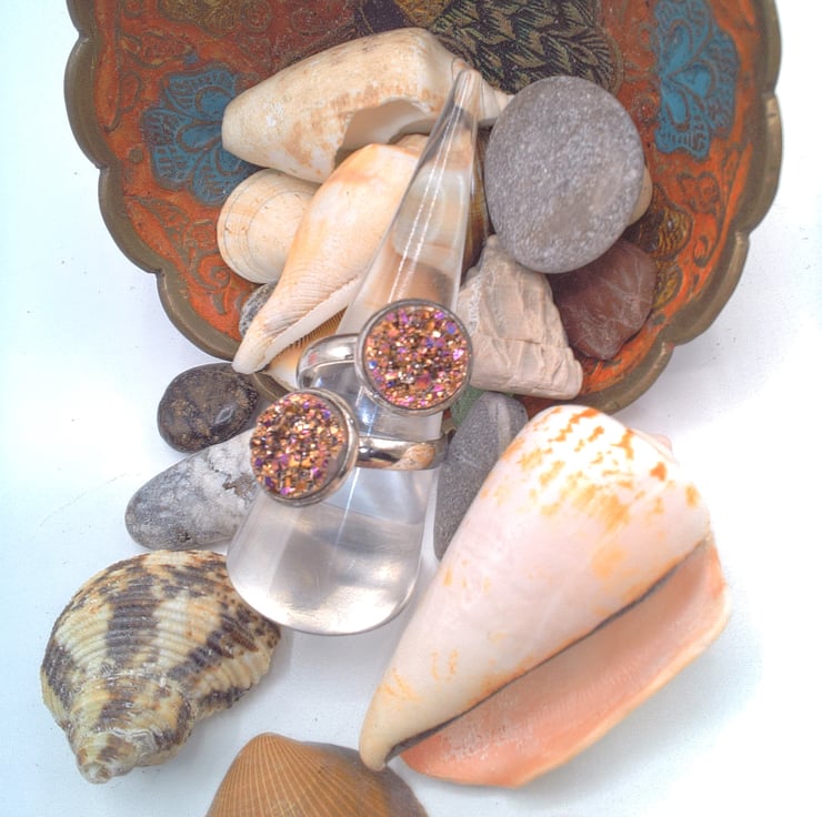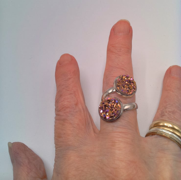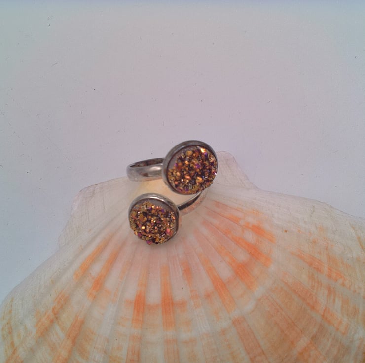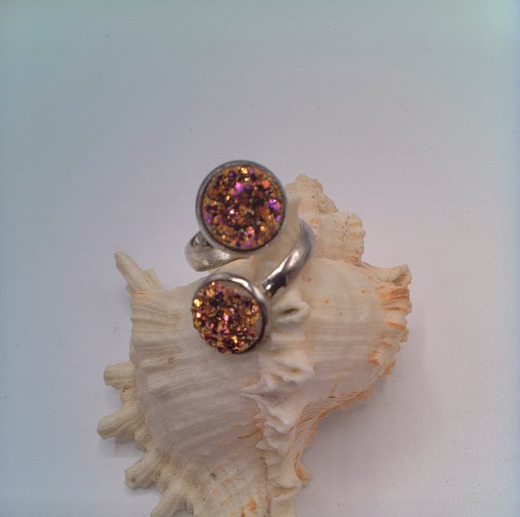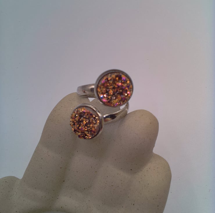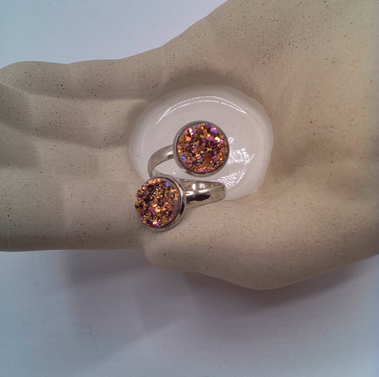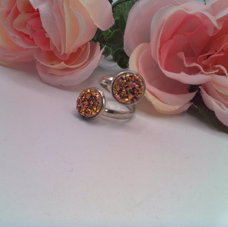 This cute adjustable ring would make an ideal gift for a friend or relative for a birthday or anniversary, or it would make a nice treat for yourself. It would go well with any of your Spring or Summer outfits for a day out, for a casual party, or for everyday wear. The ring base is adjustable so it will fit most sized fingers and it has two 12 mm round pink and gold faux druzy cabochons set into the silver plated base. The ring will be dispatched wrapped in tissue paper in an organza bag and delivered to you via Royal Mail first class post. The actual shade of the cabochon may vary depending upon your monitor set up.