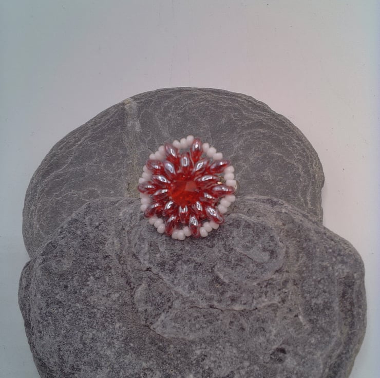 This very pretty adjustable ring would make an ideal gift for a friend or relative for a birthday or anniversary, or it would make a nice treat for yourself. It would go well with any of your Spring or Summer outfits for a day out, for a casual party, or for everyday wear. The ring base is adjustable so it will fit most sized fingers and it has a hand sewn beaded mandala attached to the silver plated base. The mandala is made using white seed beads and red duo beads with a red glass crystal at the centre. The ring will be dispatched wrapped in tissue paper in an organza bag and delivered to you via Royal Mail first class post. The actual shade of the cabochon may vary depending upon your monitor set up.