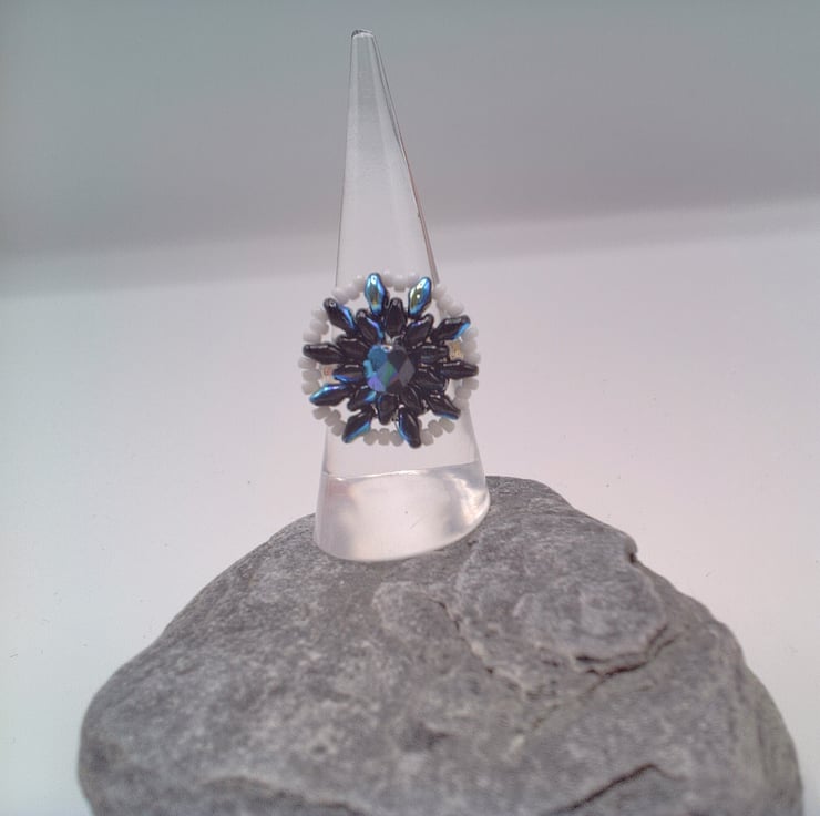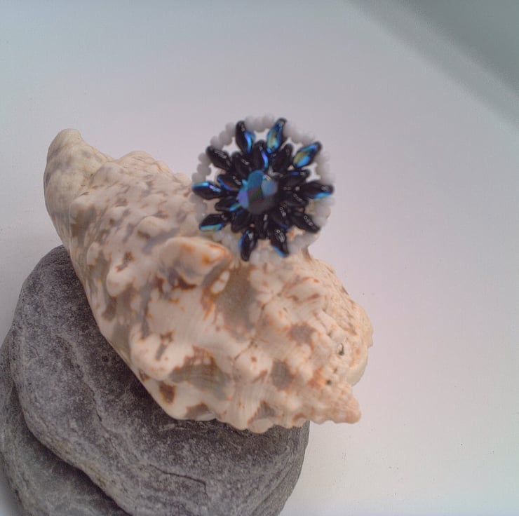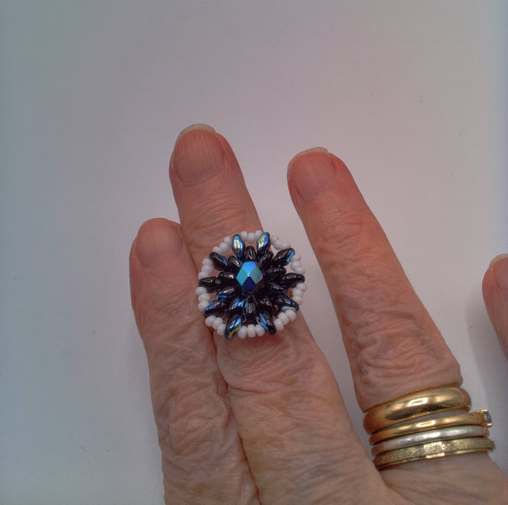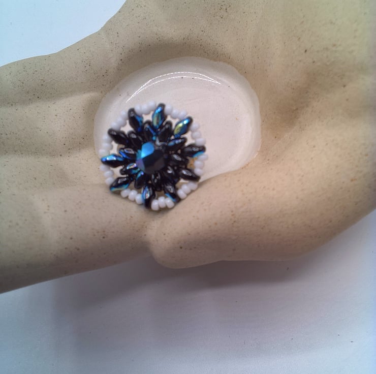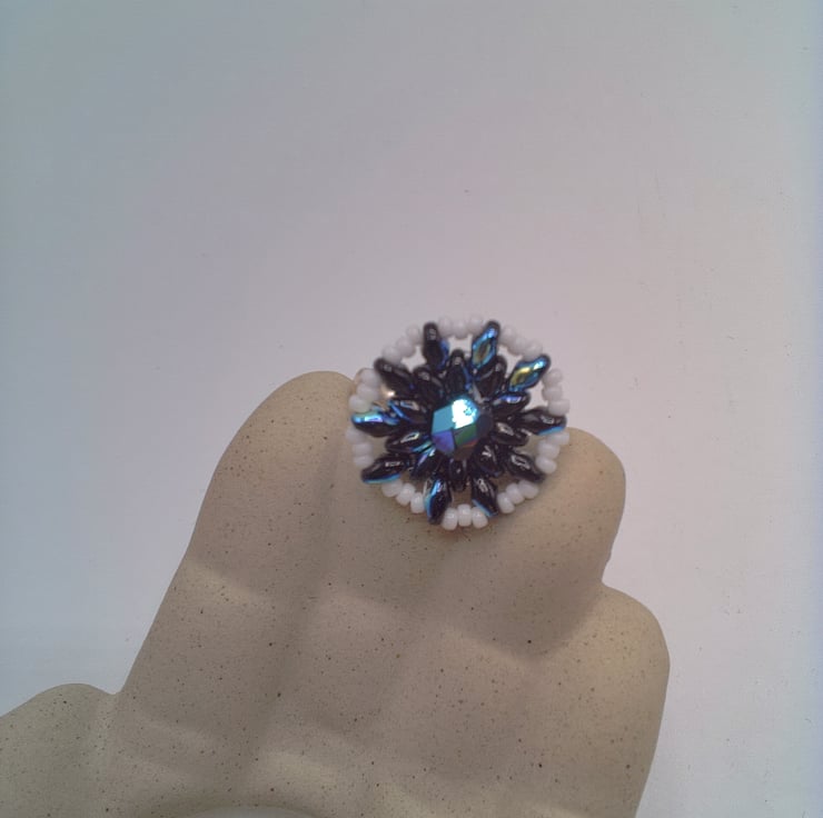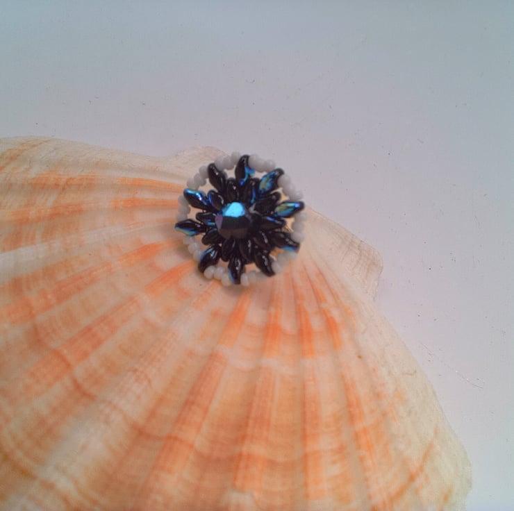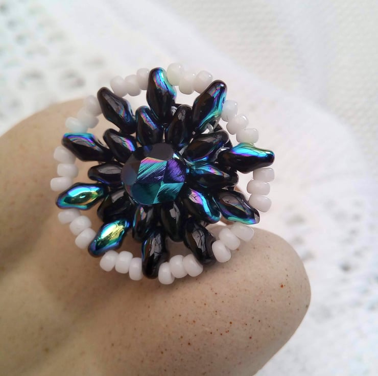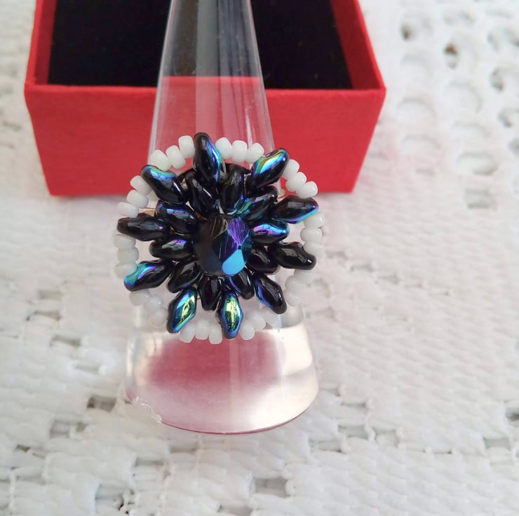 This cute adjustable ring would make a lovely gift for a friend or relative for a birthday or anniversary, or it would make a nice treat for yourself. It would match well with any of your Spring or Summer outfits for a day out, for a casual party, or for everyday wear. The ring base is adjustable so it will fit most sized fingers and it has a hand sewn beaded black and white mandala attached to the silver plated base. The mandala is made using white seed beads and black super duo beads with a black glass crystal at the centre. The ring will be dispatched wrapped in tissue paper in an organza bag and delivered to you via Royal Mail first class post. The actual shade of the beads may vary depending upon your monitor set up.