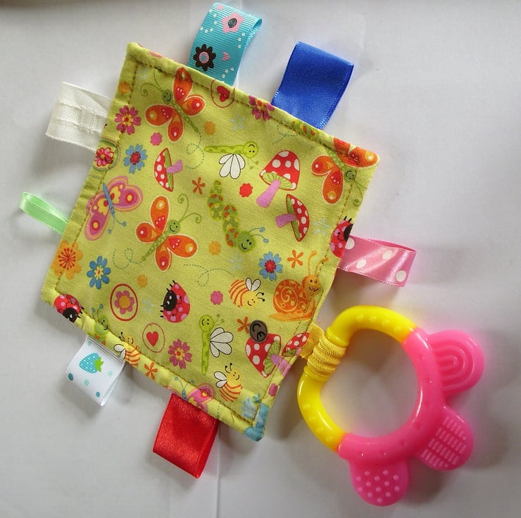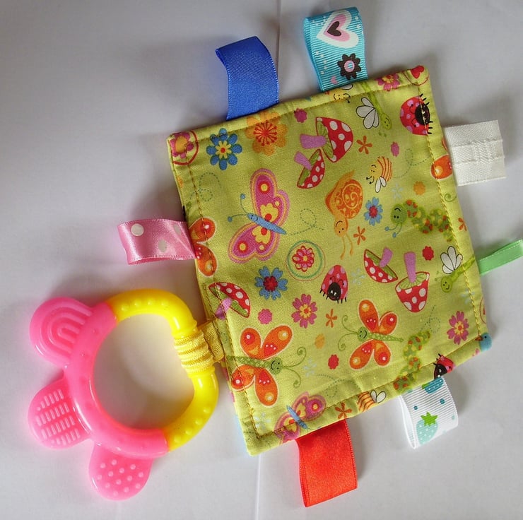 This is a very cheerful, pale yellow-green, cotton cloth (5"x5") with tags and a pink and yellow teether attached. Both sides depict insects, snails, toadstools and flowers. The tags are of various colours, widths and textures and are all double stitched for safety. The soft silicone teether is sourced from a reputable dental supplier. The tagged teether is machine washable and is CE marked.