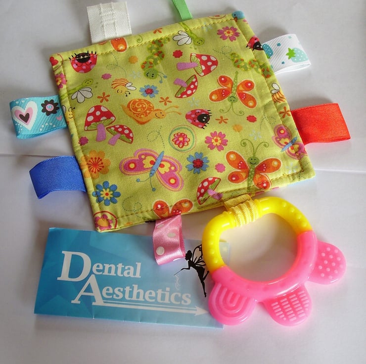 When my youngest grandchild was teething and dribbling constantly, it occurred to me that what he needed was a good teether and a cloth to wipe his sore chin. I found an offcut of cotton fabric and some ribbons from my stash and made him a tagged cloth, to use for his chin. I researched on the Internet to find a source of safe teethers, bought one and attached it to the cloth. For two years he carried his tagged-teether wherever he went. Since then I have made many tagged-teethers. I don't know what 'Dental Aesthetics' thinks I do with all those teethers!
