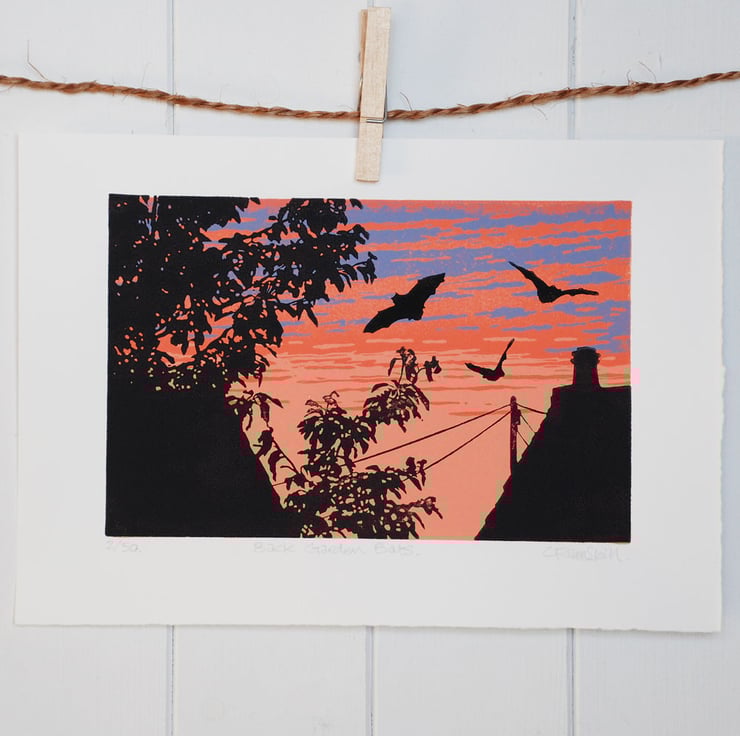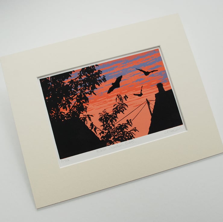 'Back Garden Bats' limited edition linocut print. Printed on hand press in four colours.
