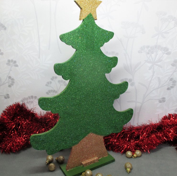 This is a wooden (MDF) Christmas tree, approximately 18 inches tall, and this style has a base so that it is freestanding.