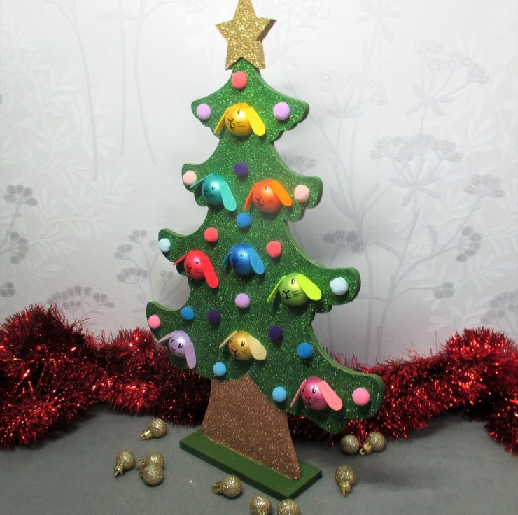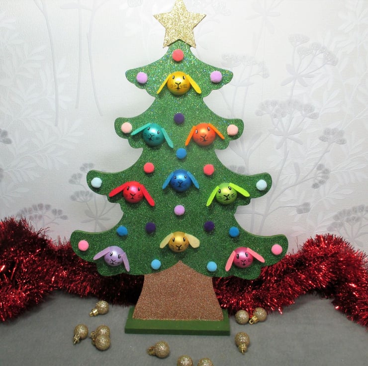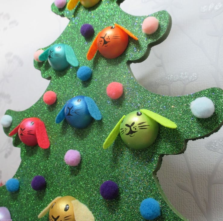 The bunny head baubles are all hand painted, and the ears cut by hand (I intentionally make the ears all a little different, as that's how real bunnies are). Between the rabbit head baubles are little pom poms which have been firmly glued on.