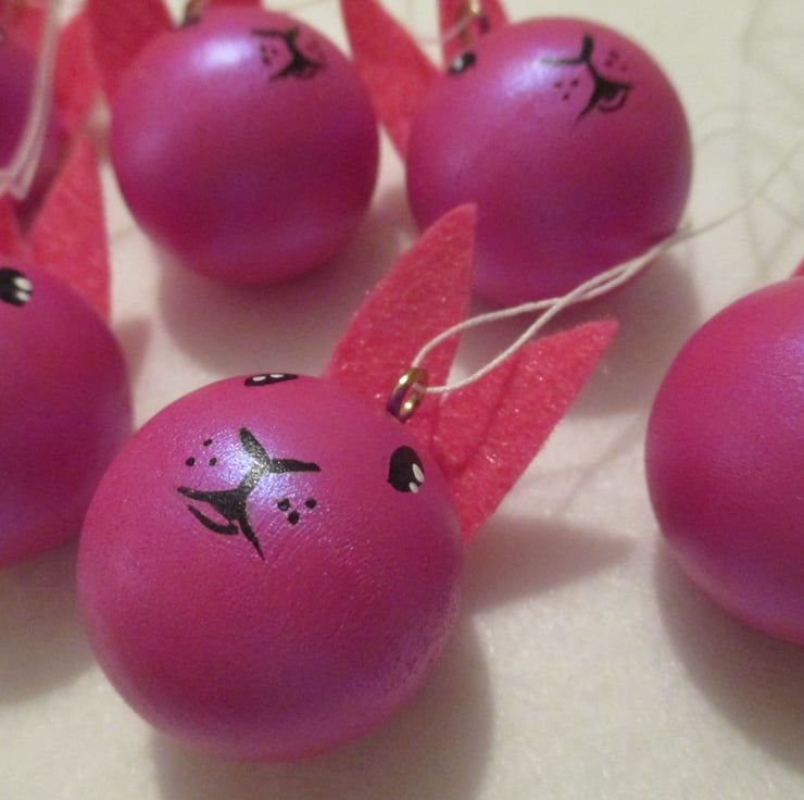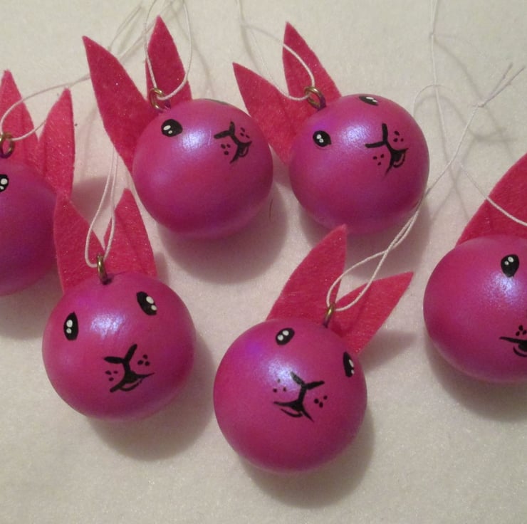 This is a set of six (6) mini bunny bauble decorations. These wee rabbit hears are wooden craft balls, hand painted in acrylics, with felt ears.