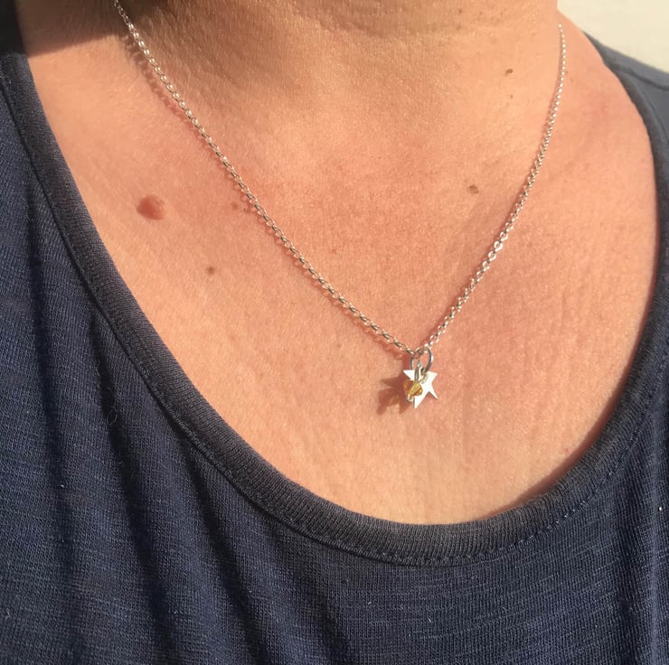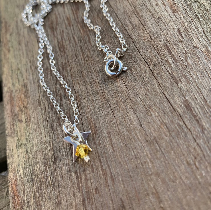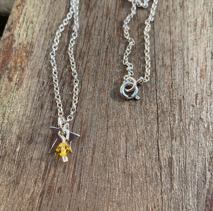 Tiny sterling silver star pendant with yellow citrine Swarovski bicone crystal bead. All chain and findings sterling silver.