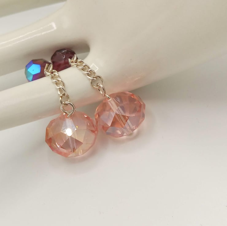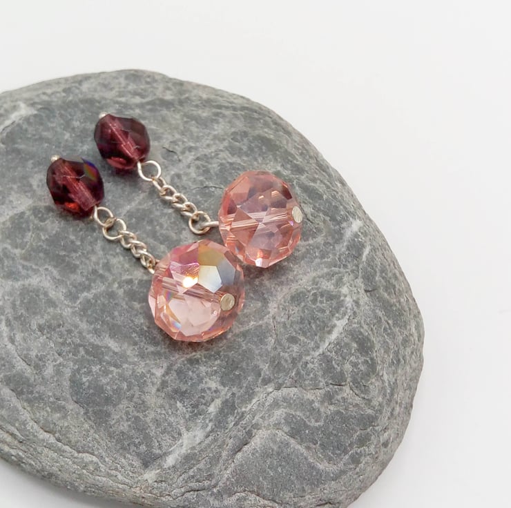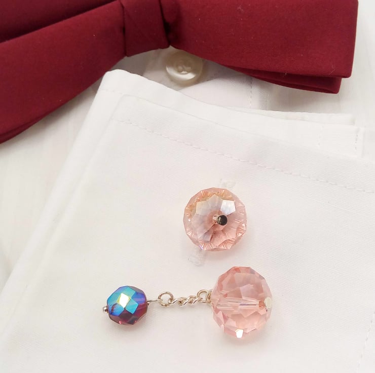 The cufflinks are made using 15 mm Pink Crystal Rondelle Beads with smaller, 8 mm purple irridescent faceted bead. Both beads are held on piece of silver plated chain 10 mm long to pass through the button holes. All metal components are silver plated.