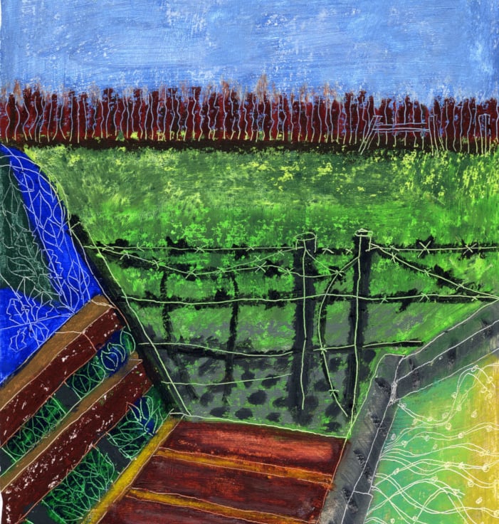 I based this image on a sketch I made while visiting Cambridge some years back. I've tried in the past to develop the drawing without success so this year decided to take a different approach by using oil pastels and a sharp point. I am happy with this result and I like the way your eye is drawn to the fence and leaves you wondering what is behind the tree line.