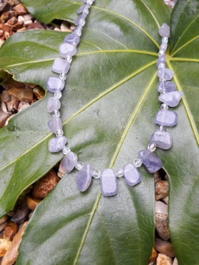 A gentle violet blue Gemstone Necklace (lolite) with 6mm round shaped beads, combined with Czech firepolished ab crystals. I have strung the beads on a specialist beaders thread called tigertail, secured with sterling silver crimp beads.