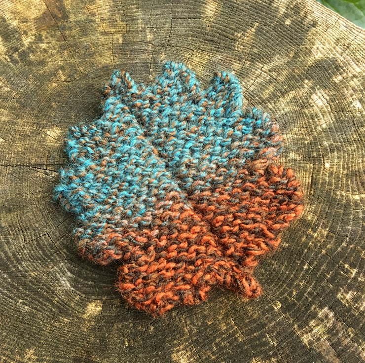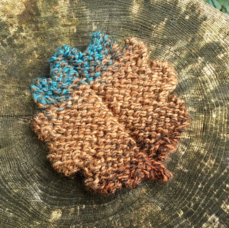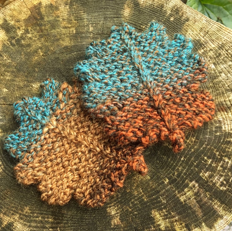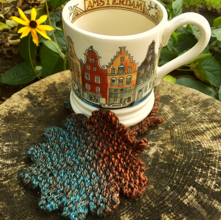 They are hand knitted with chunky marbled yarn in the shape of an oak leaf with a ribbed stem. Each individual coaster is different due to the marbled nature of the yarn.