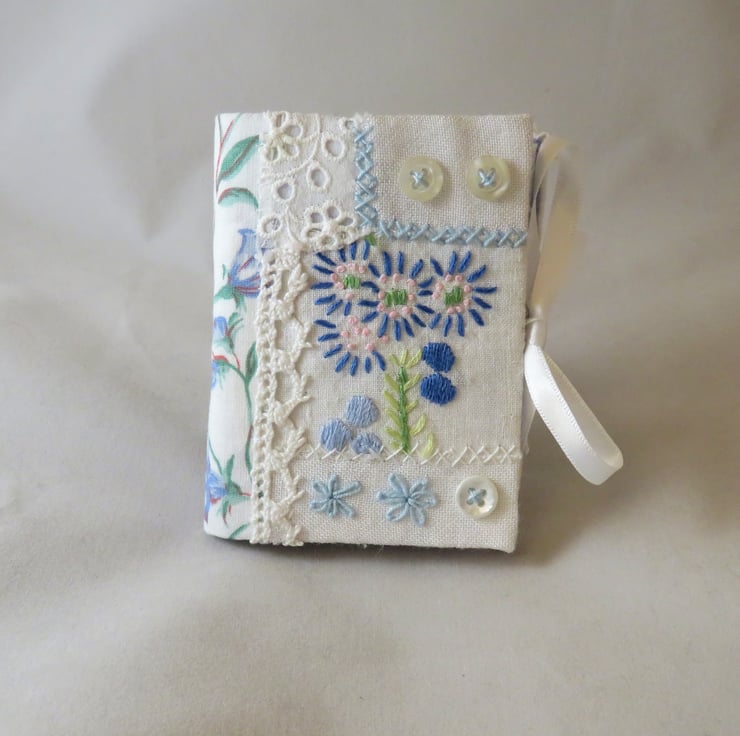 Pretty scraps of vintage line, lace buttons and embroidery combine into a patchwork to make this pretty needlebook.