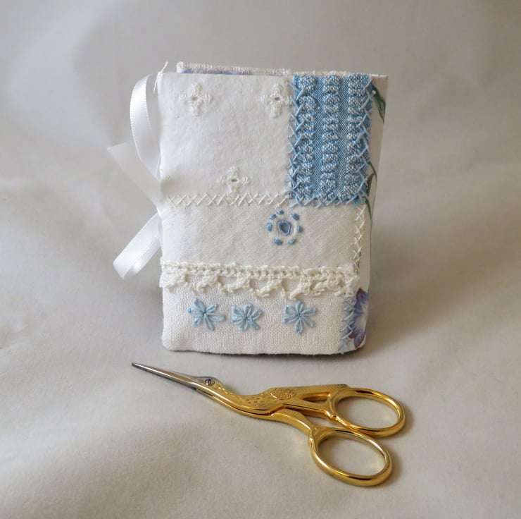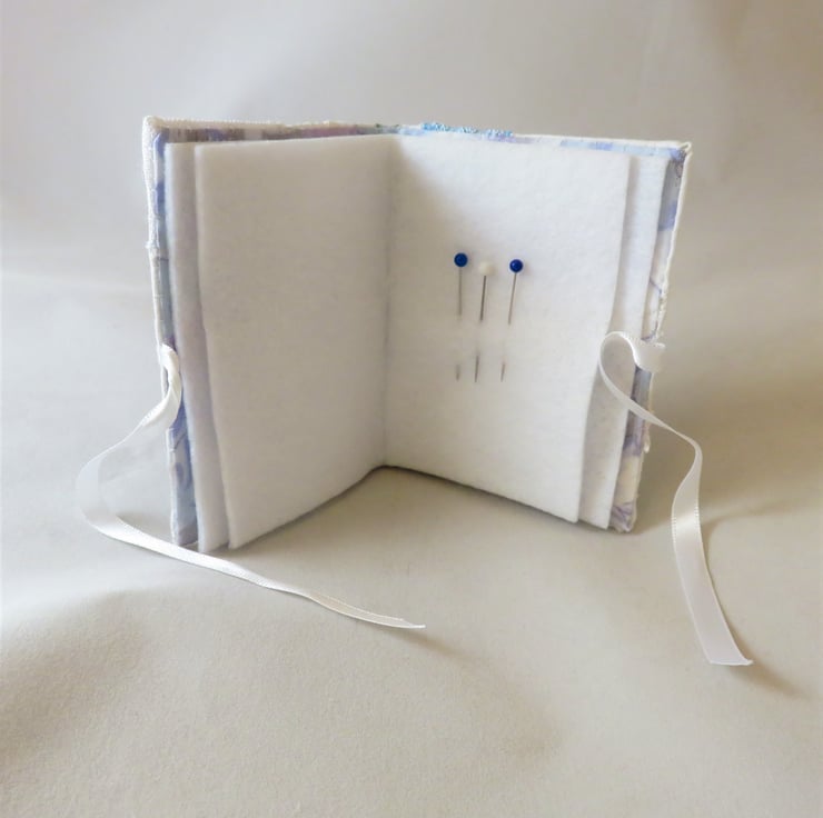 The patchwork is backed with fusible interfacing and the cover is lined with a blue and white printed, cotton fabric. Lengths of white satin ribbon close the needle book with a tied bow. Two pieces of white felt are securely stitched into the center of the cover to provide 4 'pages' for your pins and needles