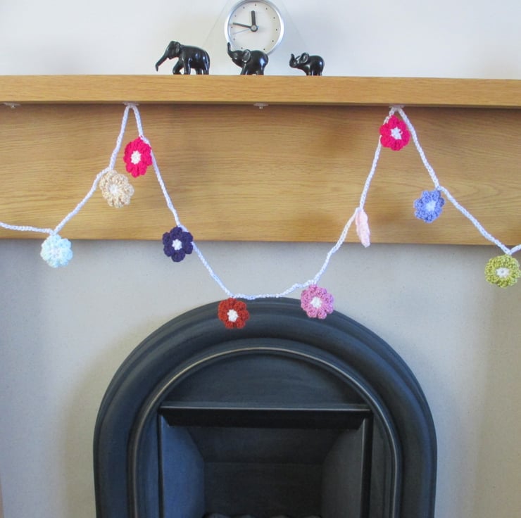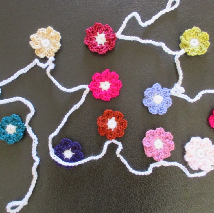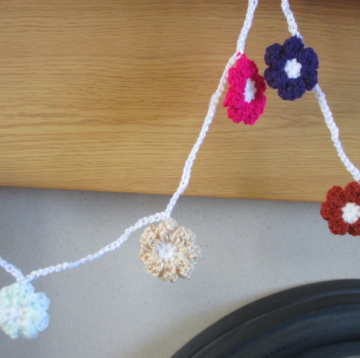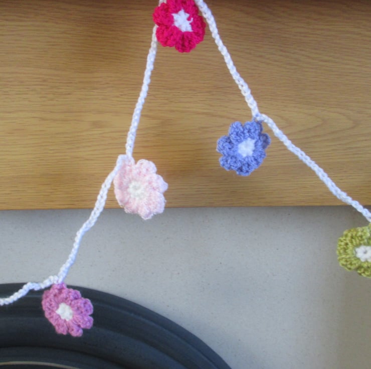 Length of crocheted bunting, which comprises of 12 individual 2 inch flowers, all different colours. The length of the bunting is 80 inches (200cm). The flowers are attached by a length of crocheted white chain stitches.