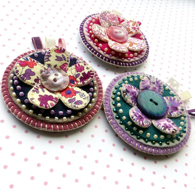 The fabric flower is in beautiful Liberty of London fabric. It has been stitched onto a teal circular felt base. This has then been backed by light grey and lilac felts and features seed beading around the circumference. It has been finished with a large central teal button and three little ribbon tag details in coordinating colours. There is a metal brooch pin on the reverse side for easy attachment.