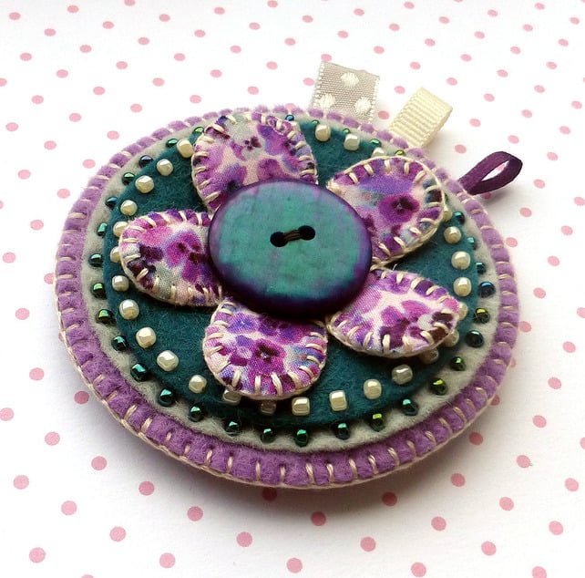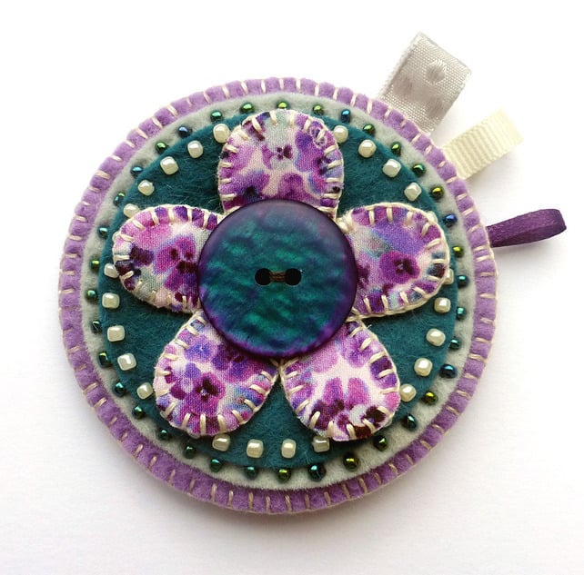 This is a lovely hand stitched flower brooch in shades of purple and teal, great colours for Autumn and Winter!