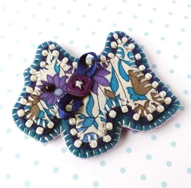 It features an applique Scottie in lovely Liberty of London fabric in beautiful shades of teal and purple. It has been stitched onto navy blue felt which has been edged with cream seed beads. It has been further mounted onto teal felt and finished with a little ribbon collar with button detail. There is a metal brooch pin attached to the reverse side for easy attachment.