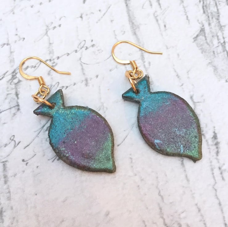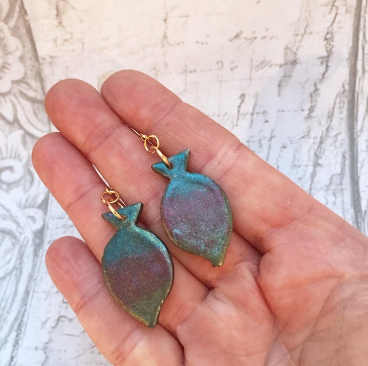 I have handpainted the back of the earring with aqua blue metallic acrylic paint, with added layers of varnish. I've teamed these fish with gold plated findings, with the earring hooks themselves made from hypoallergenic surgical steel.