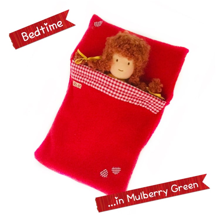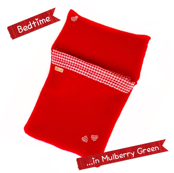 A lovely cosy sleeping bag bed for the Mulberry Green characters. The bed is made from really soft red fleece and is trimmed with red gingham and three little gingham hearts. Perfect for bedtime.