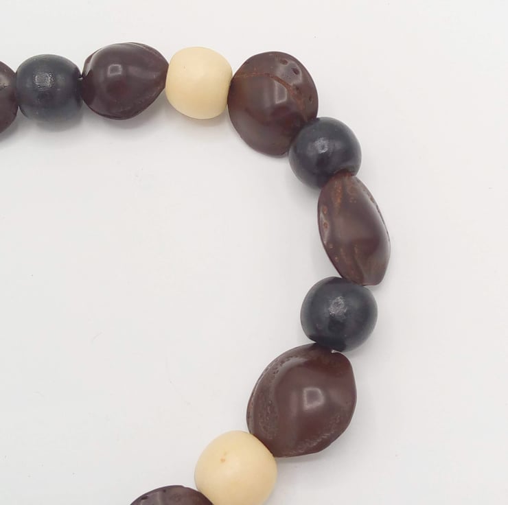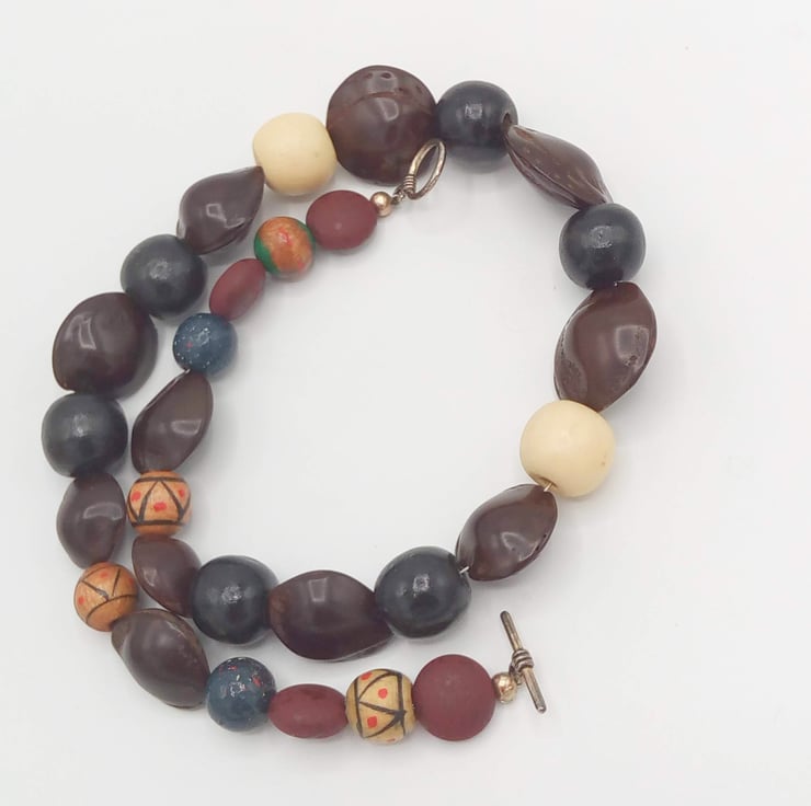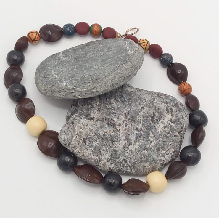 The necklace is made using wooden beads ranging in size from 12 mm to 18 mm, and some plain white or brown and some painted in red and green, and also brown dried seeds approx 20 mm to 25 mm round. The clasp is a silver plated toggle clasp. It is 42.5 cm long.