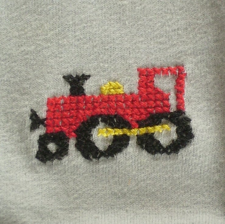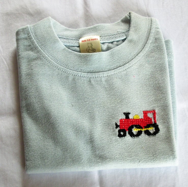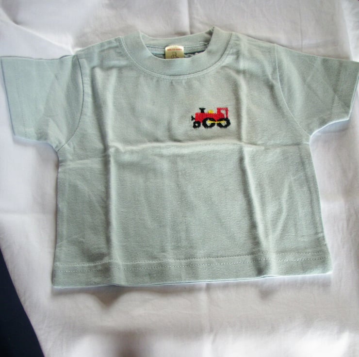 This would make a perfect gift for a new baby. It is a sweet baby-blue soft cotton T-shirt, upon which I have hand-embroidered a red toy engine with golden yellow dome and piston rod. It can be machine washed As I never use a permanent backing material when hand embroidering kids' clothing, there is nothing inside to irritate your child's skin.