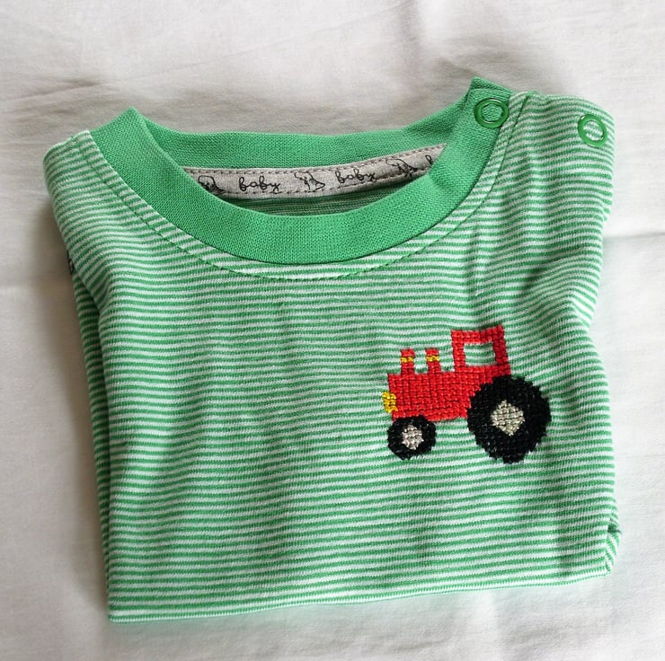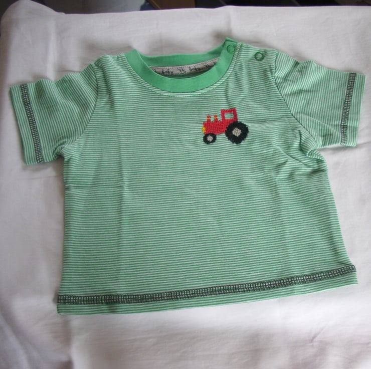 This would make a perfect gift for a new baby. It is a cute, green-striped soft cotton T-shirt, with press studs at the neck. I have hand-embroidered a red tractor on it. The shirt is machine washable.
