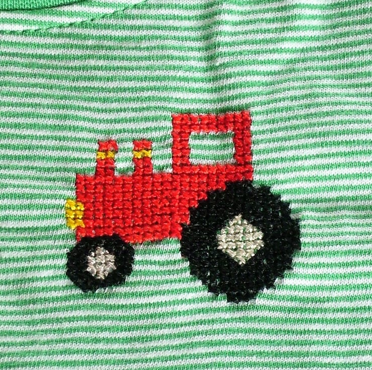 The tractor motif has been very popular for many years. I first designed it for the four year old son of a friend, who asked me to stitch his Daddy's tractor. He was bitterly disappointed when I embroidered a red one, as Daddy's tractor was a John Deere!
