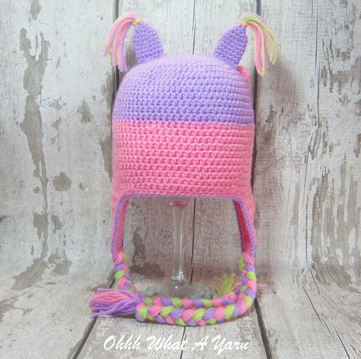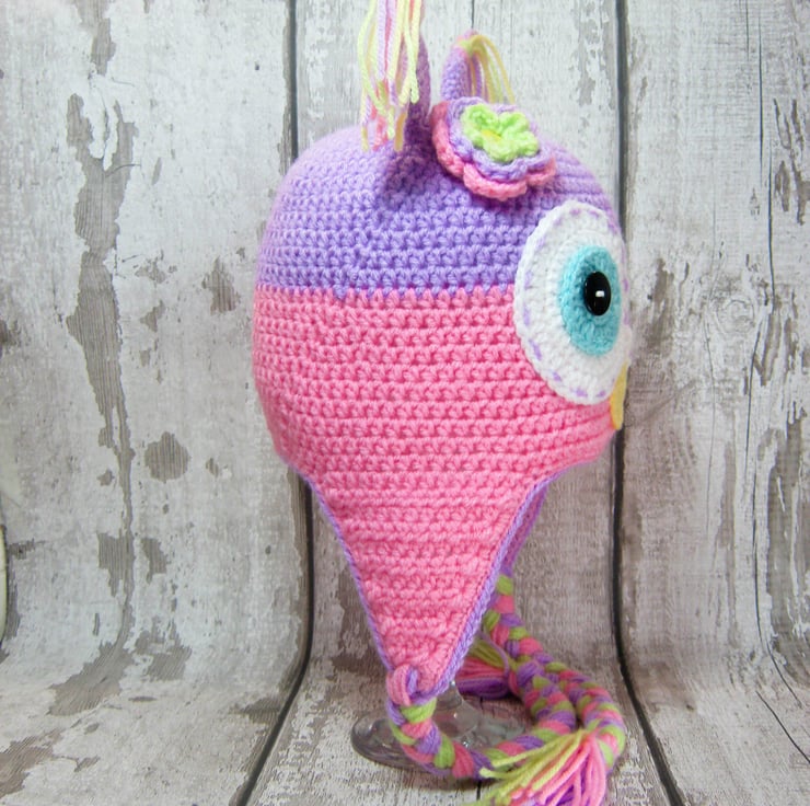 She has crochet ear flaps and plaited ties with tassels, ears with tassels and a pretty crochet flower on her head.