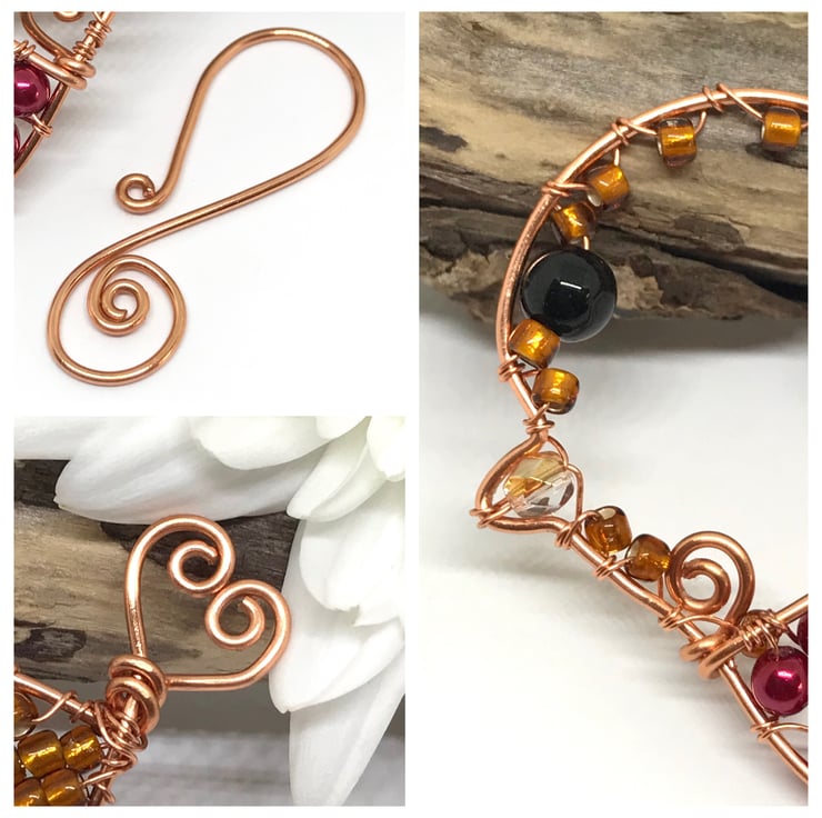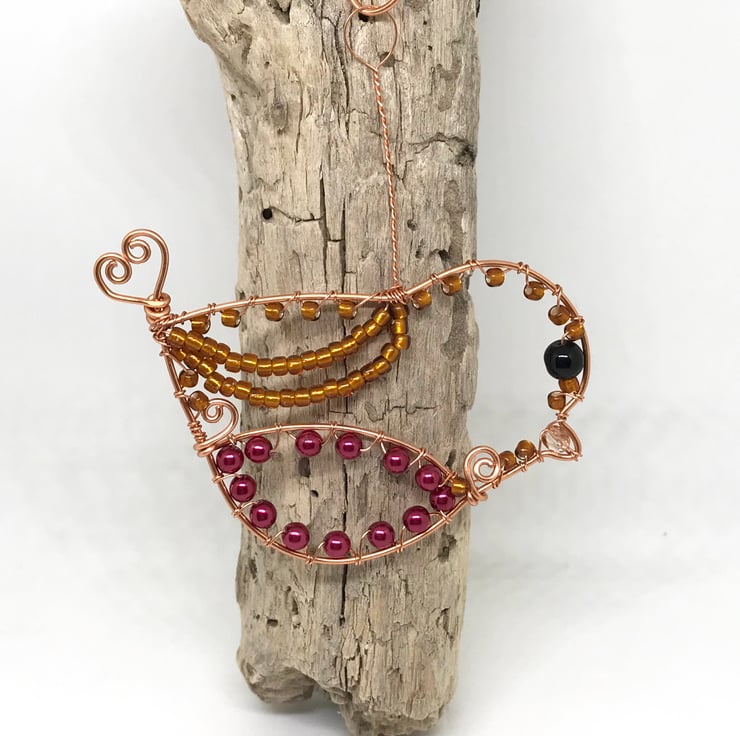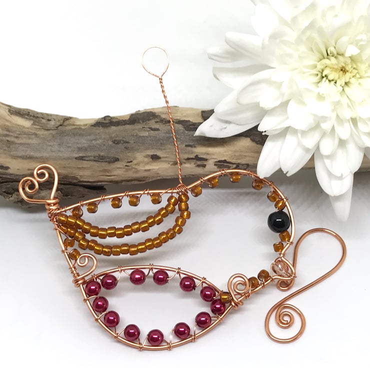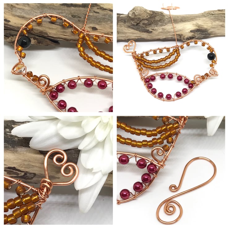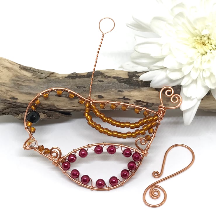 I have created this Robin decoration with copper wire using wirewrapping techniques. The copper wire has been formed into the shape of a bird and seed beads in gold, dark pink glass pearl beads and a Czechs crystal bead for the beak have been wrapped around the framework of the bird with a larger black glass bead for the eye. I have formed the tail of the Robin into a heart shape. A handcrafted copper hook is included for hanging this decoration.