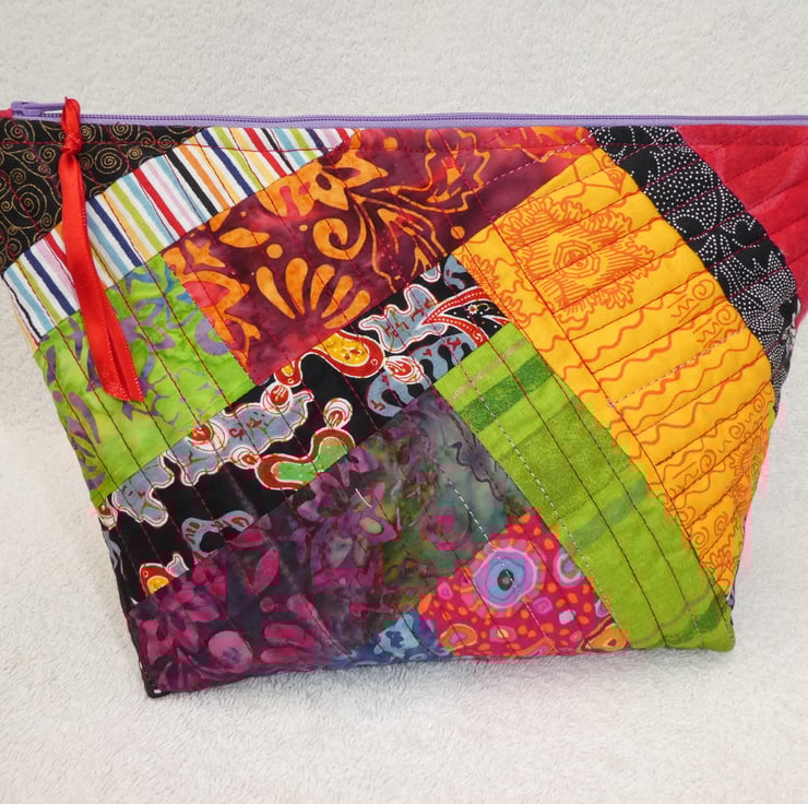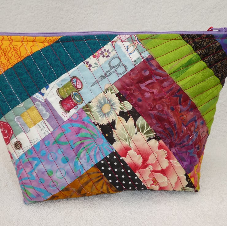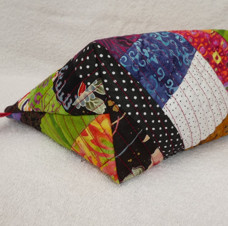 This fabulous holdall has been created from crazy patchwork and is machine quilted over wadding using a variegated thread. It is fully lined and has an internal decorated pocket. The pouch has a squared off base to make it really nice and roomy, and free-standing.