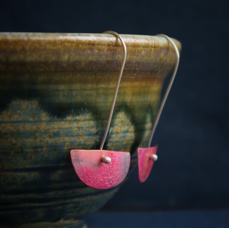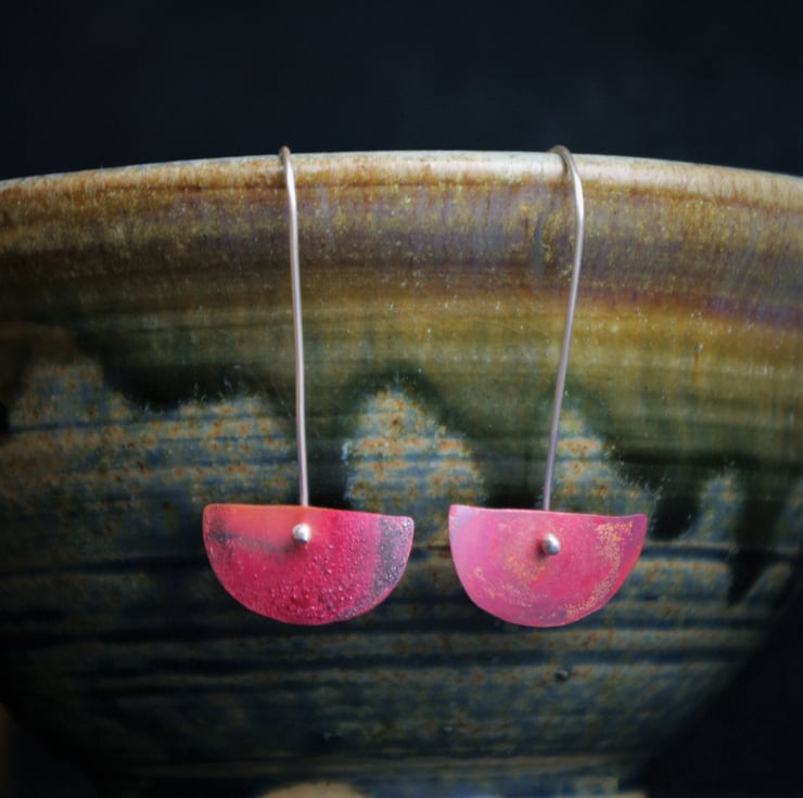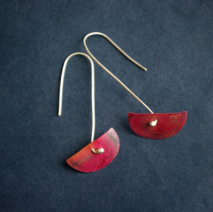I have cut out pieces of copper into arc shapes, with a diameter of 23mm/ just under 1 inch . They hang from long handmade ear hooks, made with sterling silver wire. I have given the copper a luscious red colour , which has tones of purple and small areas of shiny copper . The surface has a texture to it due to a process called reticulation which gives a rippled effect . The total dangle is j48mm / just under 2 inches.