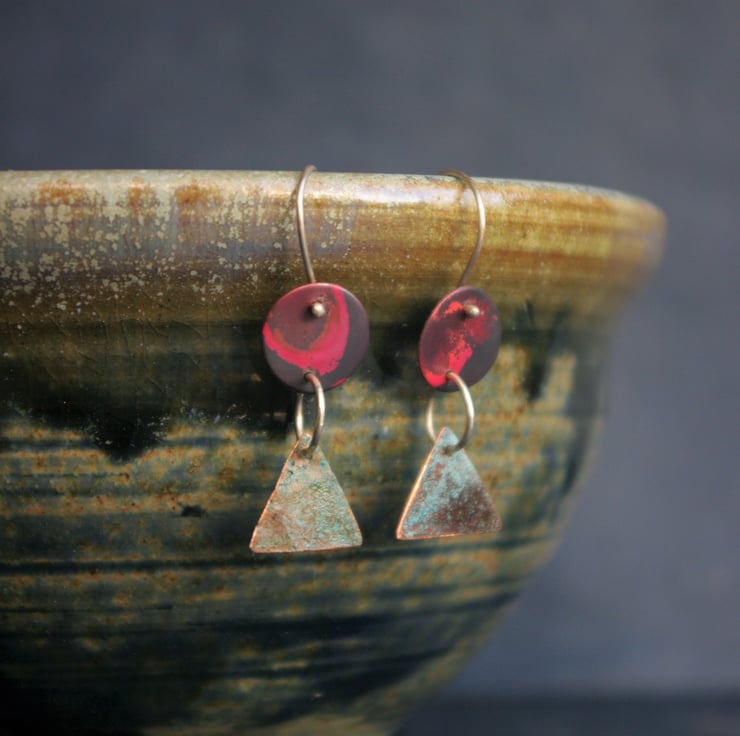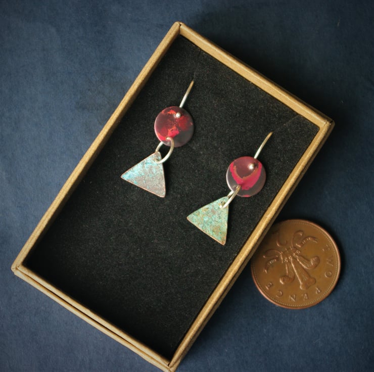 I have cut triangles and circles from copper sheet . The triangles have undergone a process of patination to produce a turquoise colour and some texture within the copper. The circles have taken on a luscious red colour with some striking black shapes through careful heating. The shapes are joined with sterling silver round jump rings and the total dangle is 35mm/ nearly 1.5 inches from the top of the sterling silver ear hook .